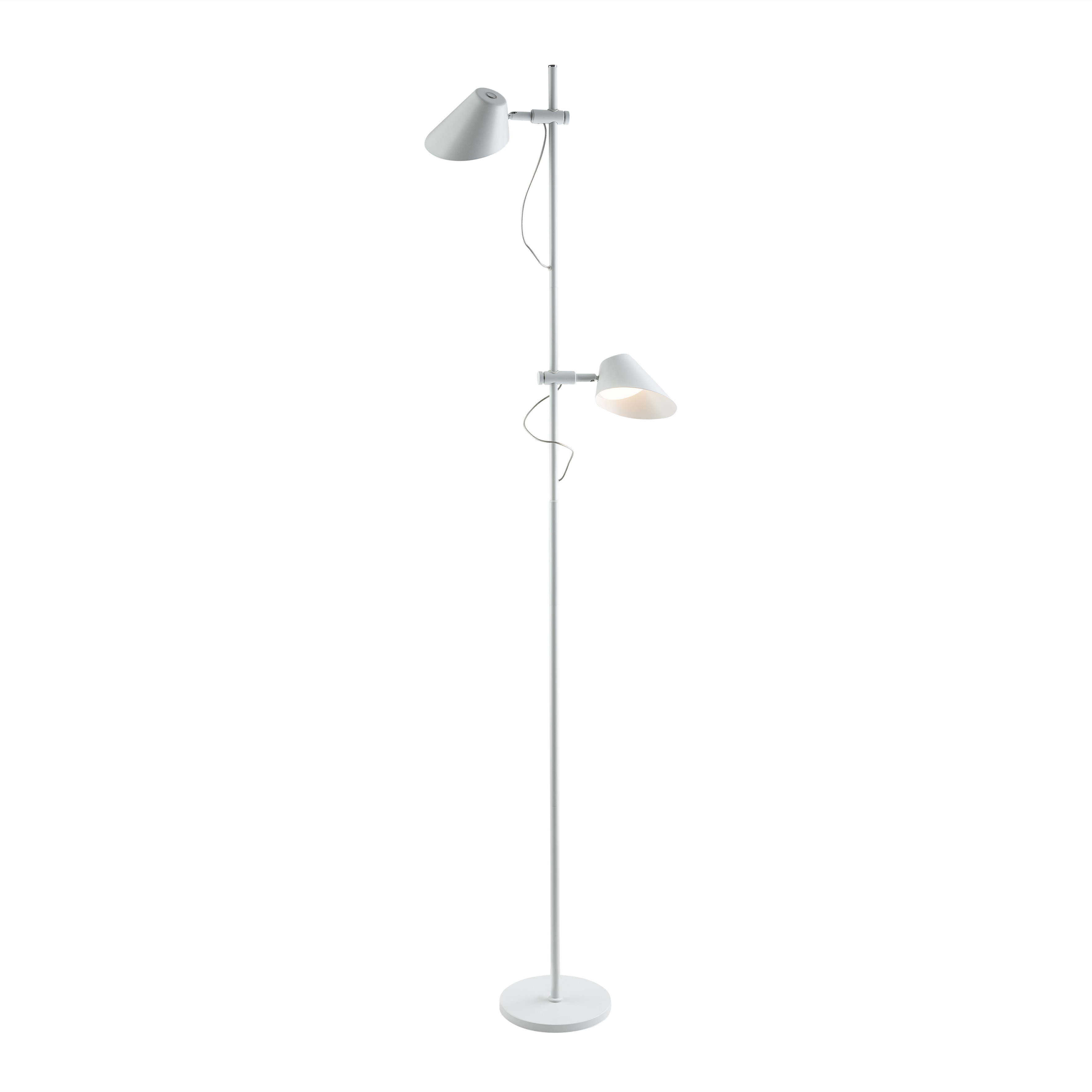 Напольный светильник из металла и алюминия, матово-белый, опаловый рассеиватель. Сенсорная кнопка и ПУЛЬТ ДИСТАНЦИОННОГО УПРАВЛЕНИЯ. 2 регулируемых по высоте и поворотных светильника, одновременные и независимые функции: регулировка яркости света, регулировка цветовой температуры. Светодиод 20 Вт, 1800 лм, CCT 300