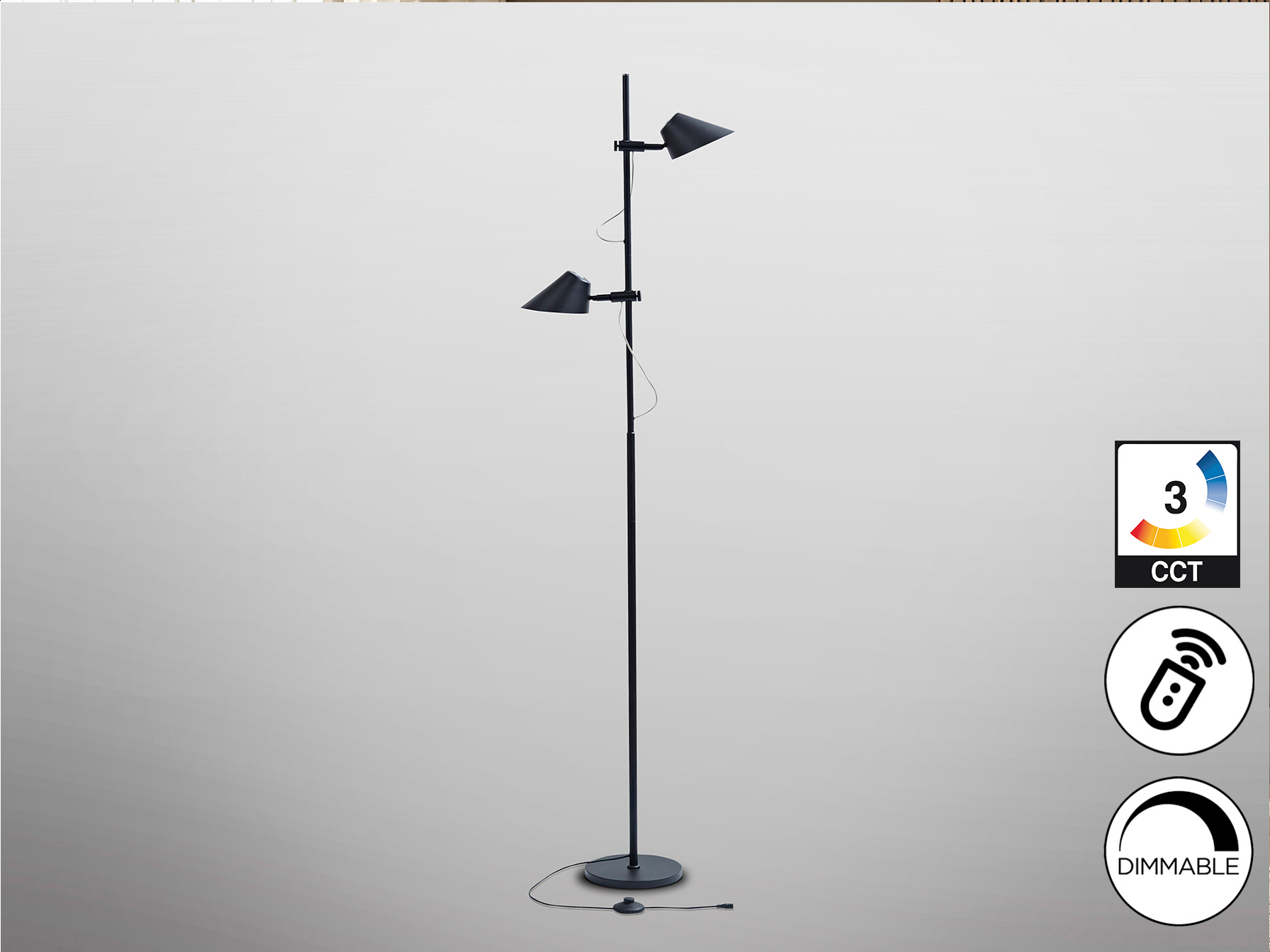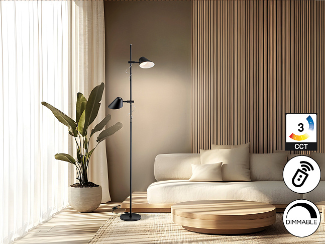 Напольный светильник из металла и алюминия, матово-черный, опаловый рассеиватель. Тактильная кнопка и ПУЛЬТ ДИСТАНЦИОННОГО УПРАВЛЕНИЯ. 2 регулируемых по высоте и поворотных светильника, одновременные и независимые функции: регулировка яркости света, регулировка цветовой температуры. Светодиод 20 Вт, 1800 лм, CCT 3