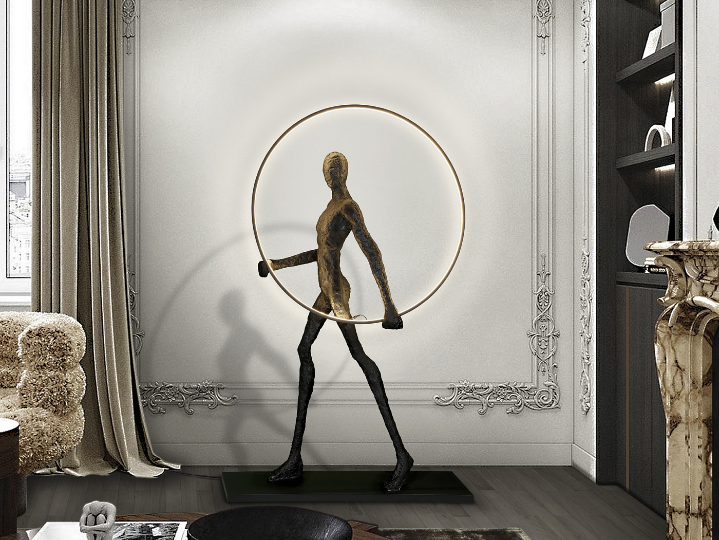 Фигурка из стекловолокна и полиэфирной смолы, матово-черная отделка. Металлическое кольцо со светодиодной подсветкой. Светодиод 3,30 Вт, 370 лм, 3000 К.