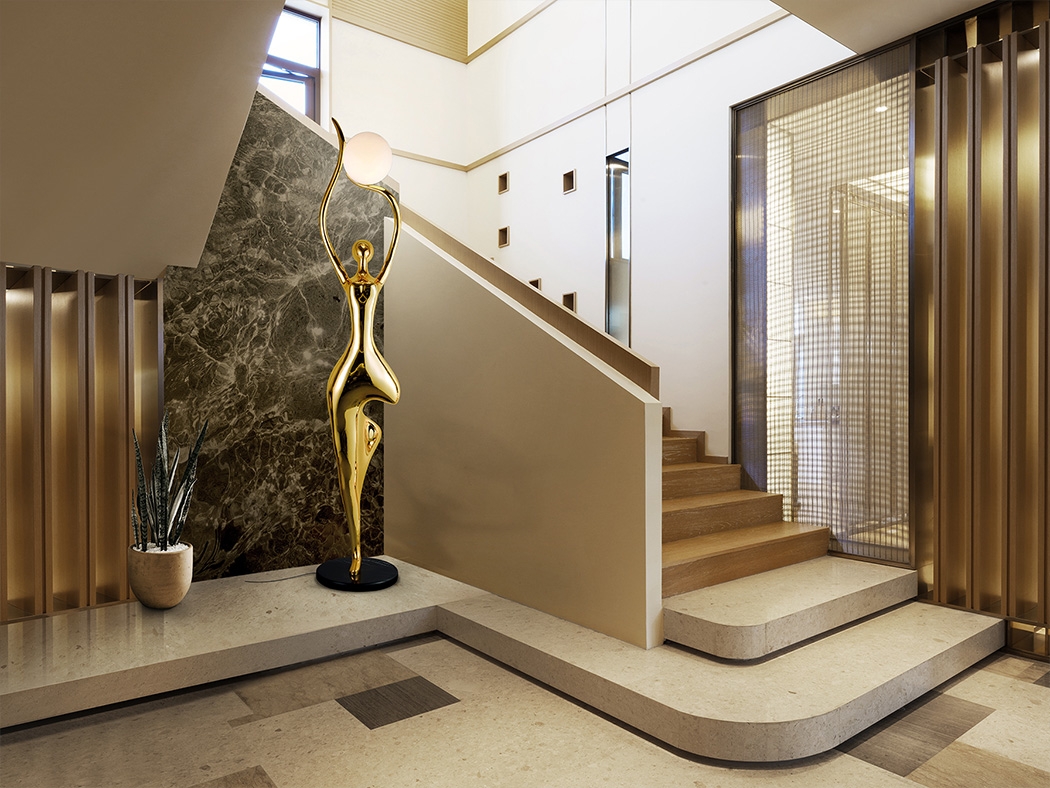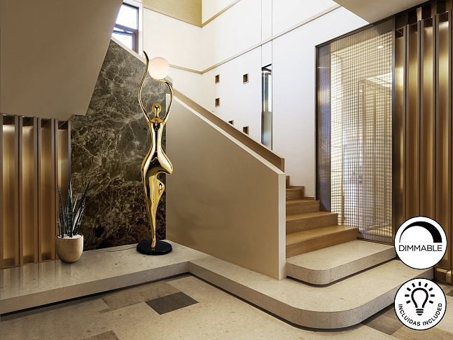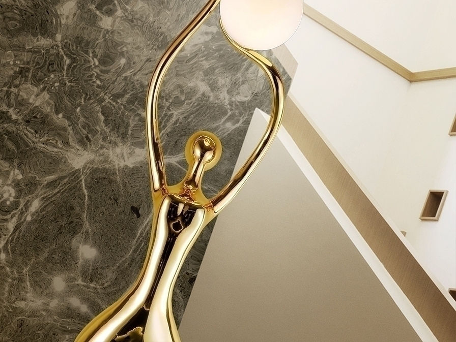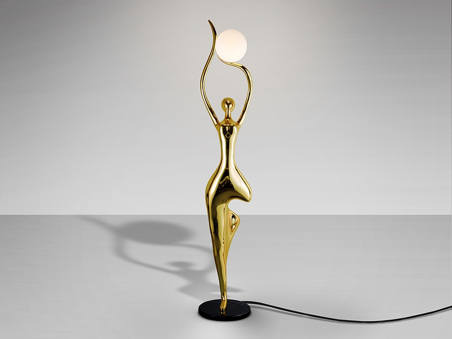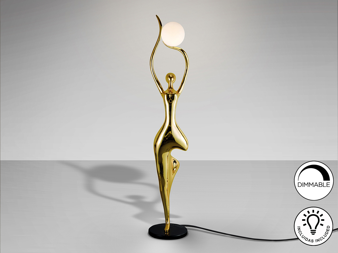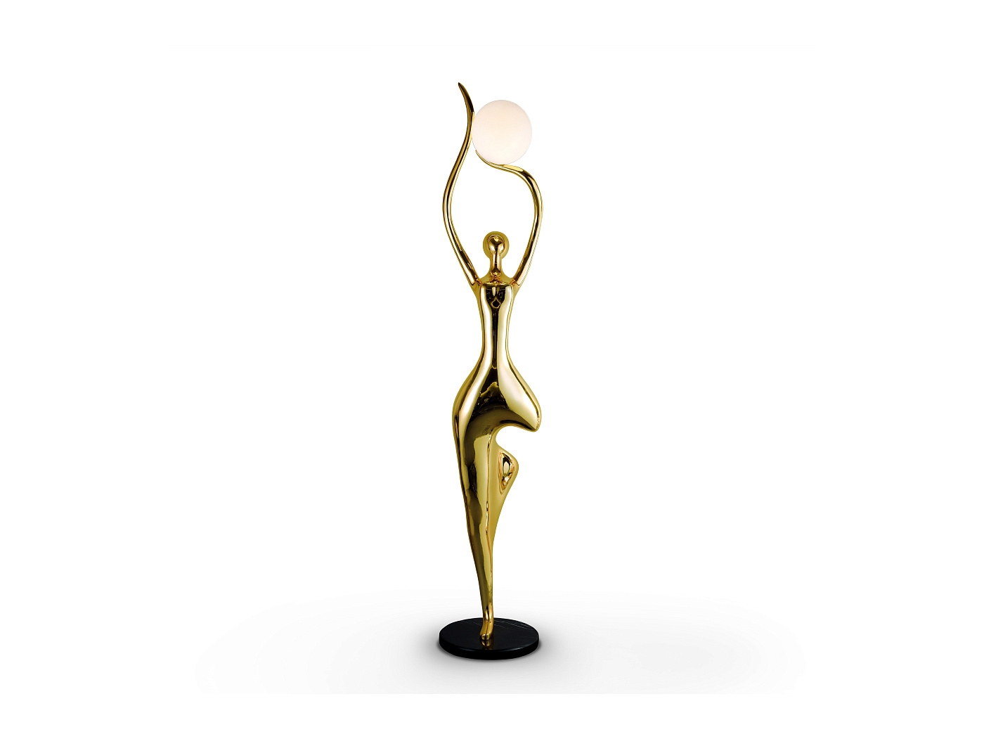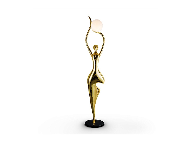 Фигурка из стекловолокна и полиэфирной смолы, отделка блестящая позолоченная, сферические акриловые плафоны с матовой опаловой отделкой. ·В комплект поставки входит 1 светодиод E27 мощностью 10 Вт.