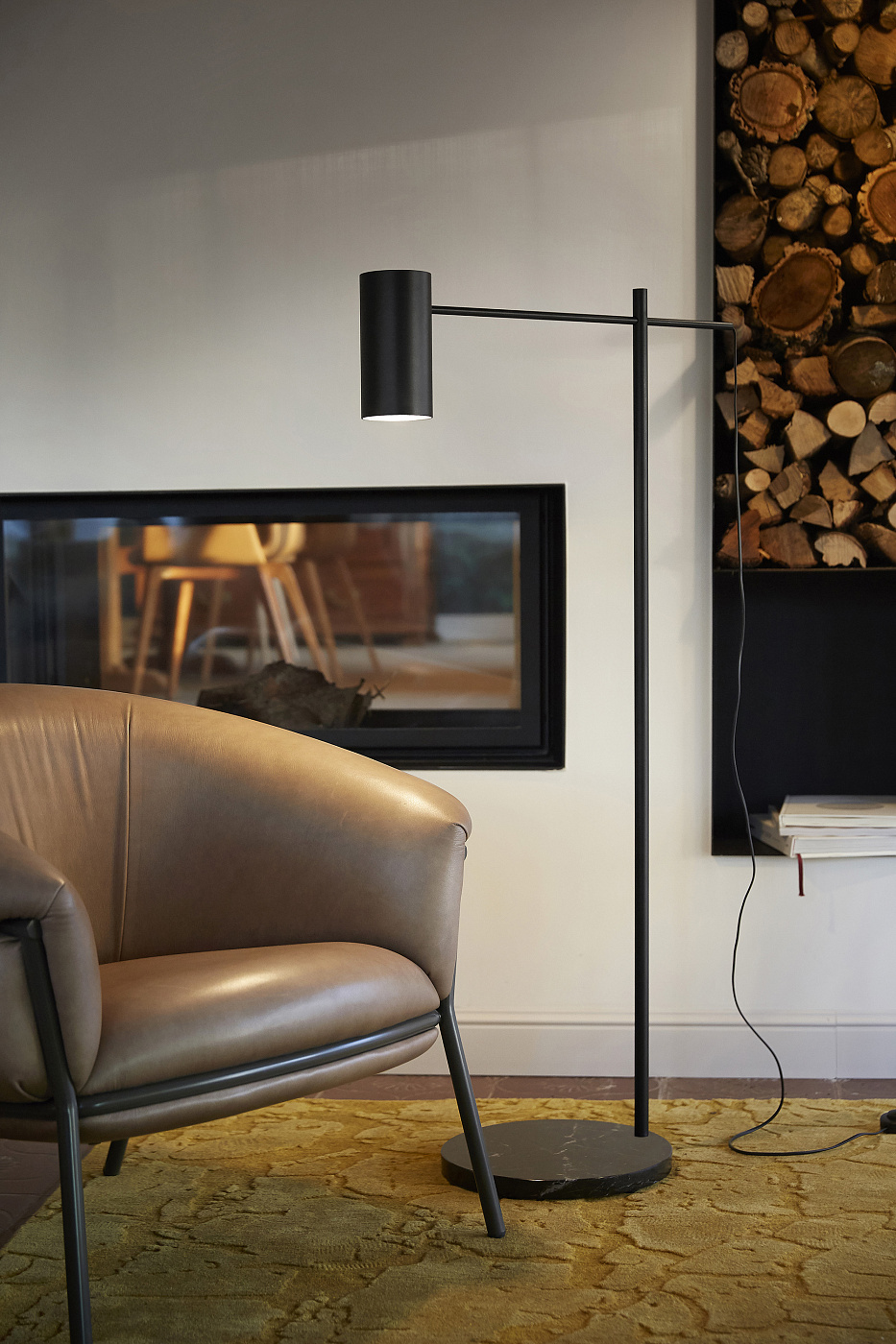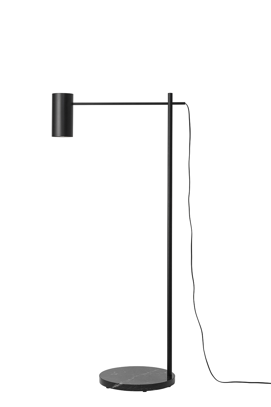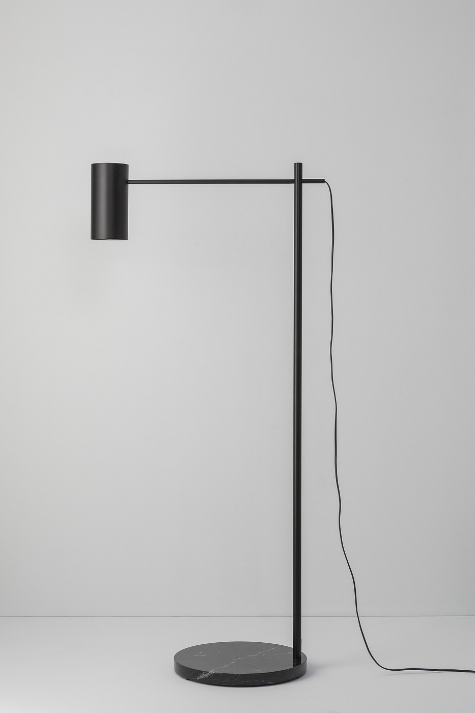 Минималистичная металлическая напольная лампа с цилиндрической головкой. Регулируемая считывающая рука с горизонтальным перемещением и вращением на 360º. Переключатель шнура включения/выключения.