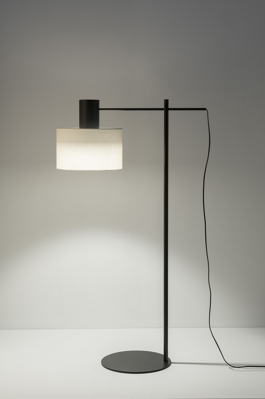 Минималистичная металлическая напольная лампа с цилиндрической головкой. Регулируемая считывающая рука с горизонтальным перемещением и вращением на 360º. Переключатель шнура включения/выключения.