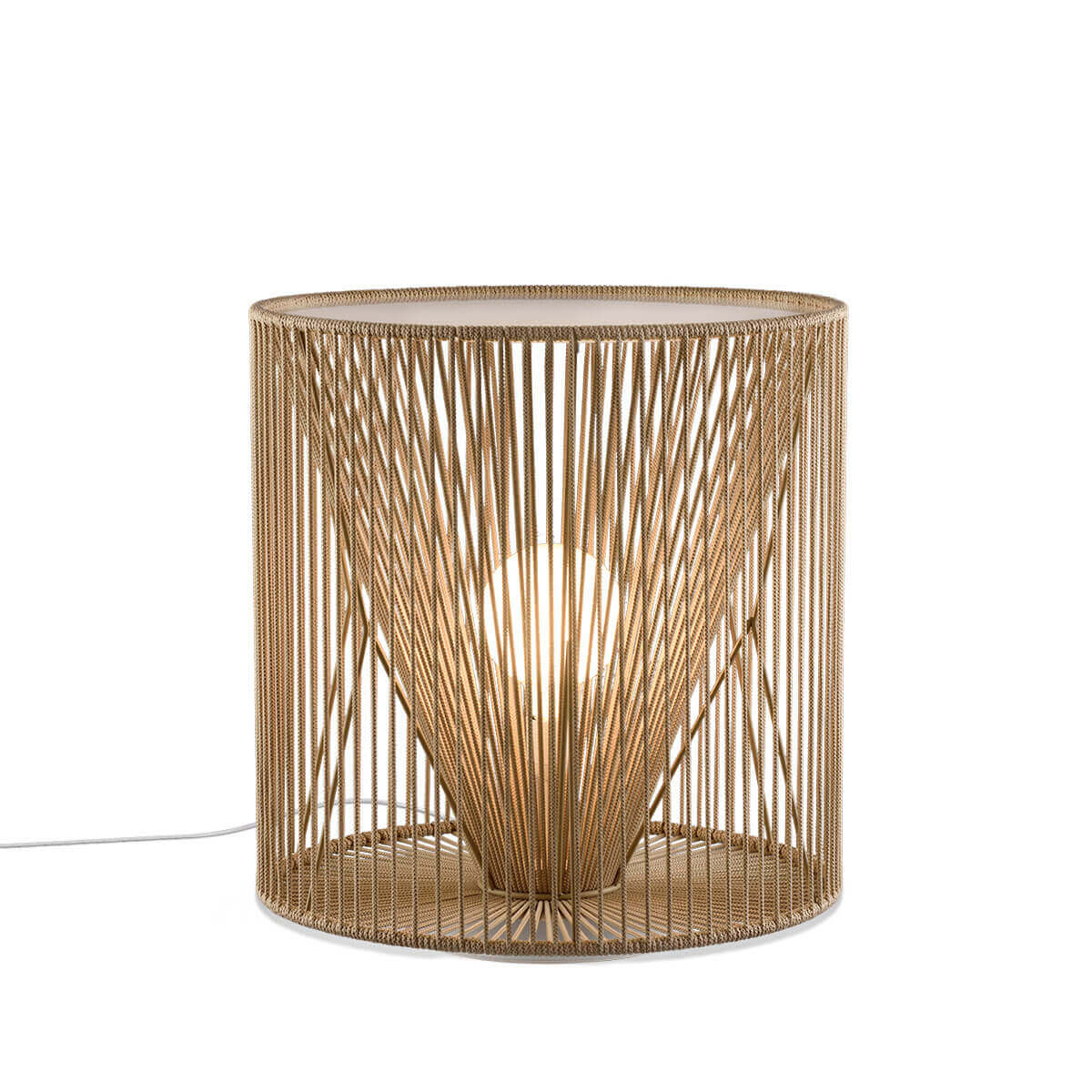 Устойчивый торшер с абажуром диаметром 80 см из плетеного шнура ручной работы, изготовленного из переработанных пластиковых бутылок , доступных в широкой цветовой гамме, и с рассеивателем из ПММА, который можно использовать в качестве приставного столика. - Лампочка в комплект не входит (1 светодиод E27). - Плетение шнура: 117 метров.