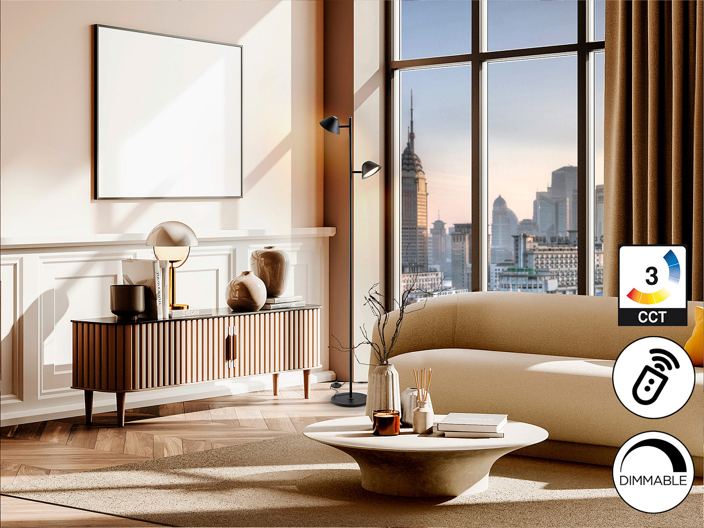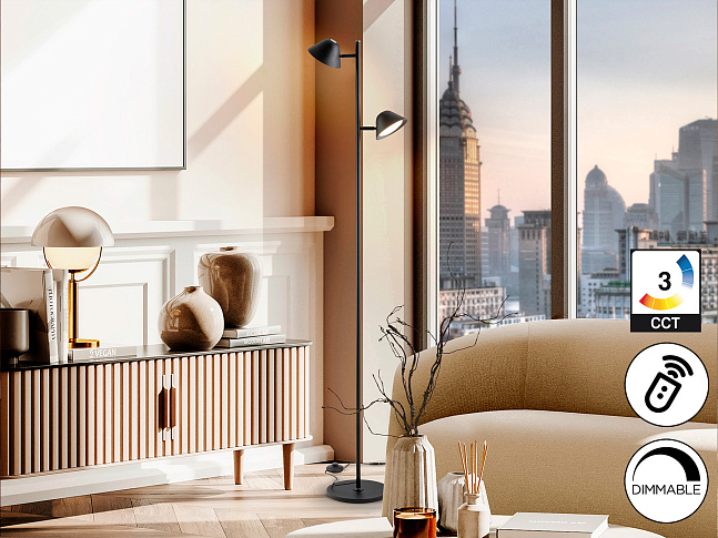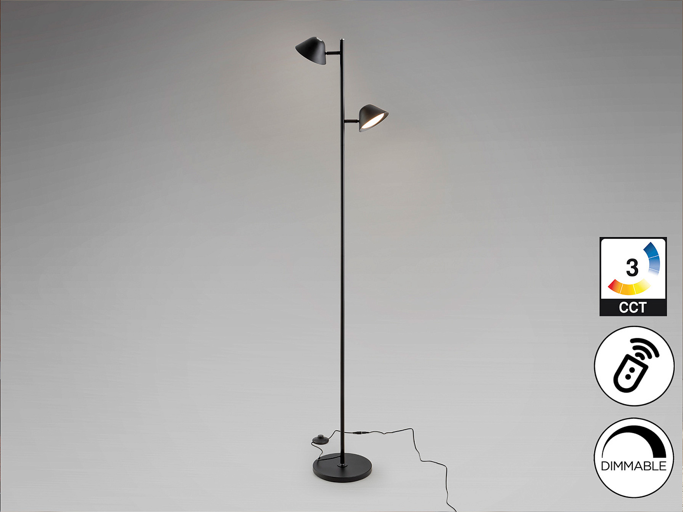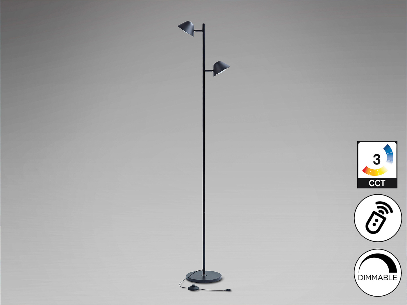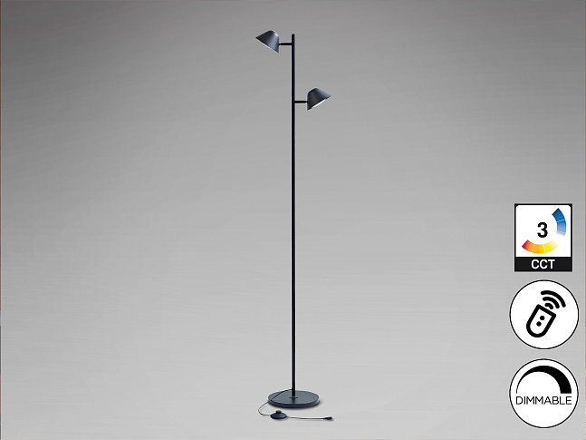 Напольный светильник из металла и алюминия, матово-черного цвета, опаловый рассеиватель. Тактильная кнопка и ПУЛЬТ ДИСТАНЦИОННОГО УПРАВЛЕНИЯ. 2 направленных источника света, одновременные и независимые функции: регулировка яркости света, регулируемая цветовая температура. Светодиод 20 Вт, 1800 лм, CCT 3000-6500K