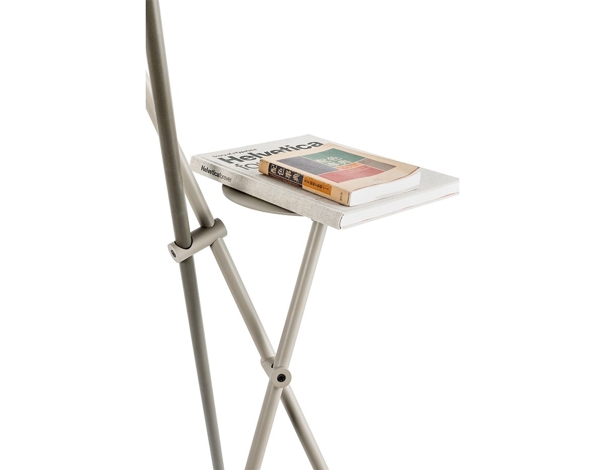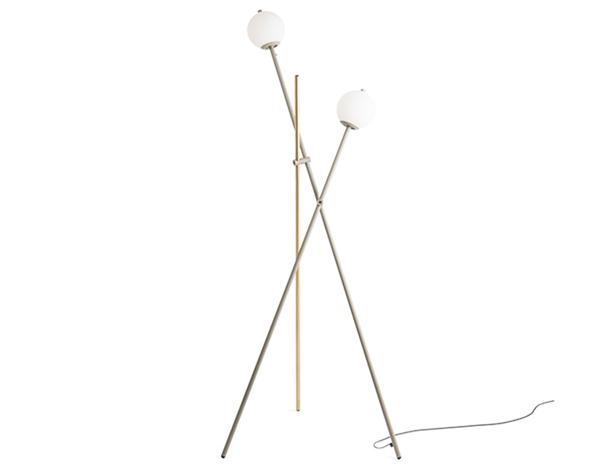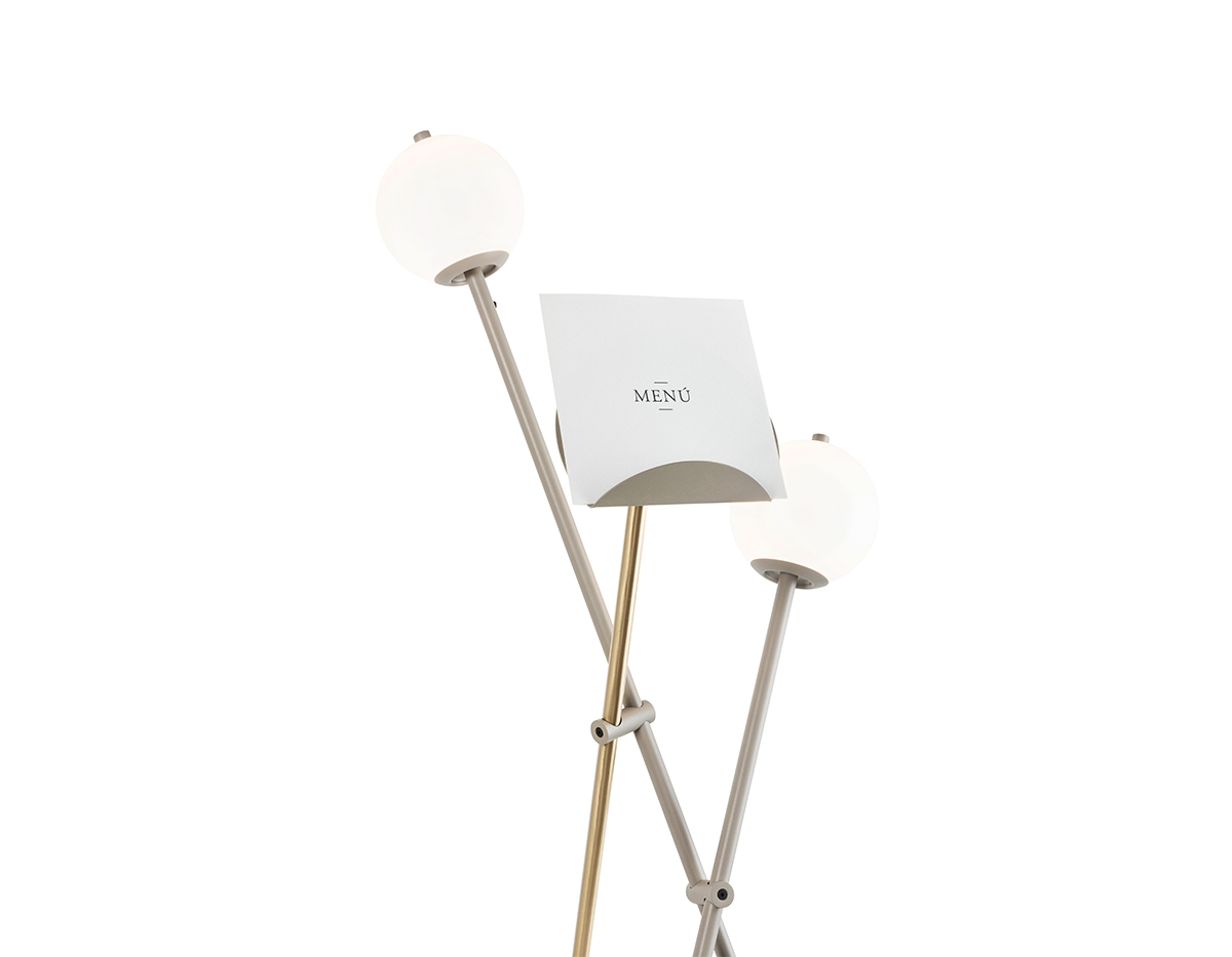 Торшер металлический с двумя стеклянными плафонами и многофункциональным кронштейном. Стержень со встроенным переключателем, обеспечивающий прямой и рассеянный свет. Могут быть добавлены аксессуары, такие как столик и держатель для журнала.