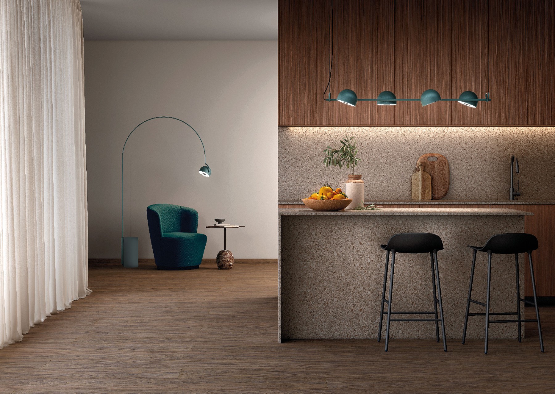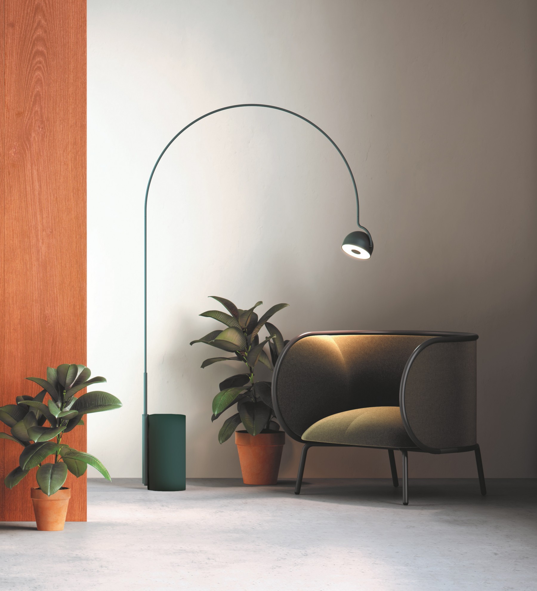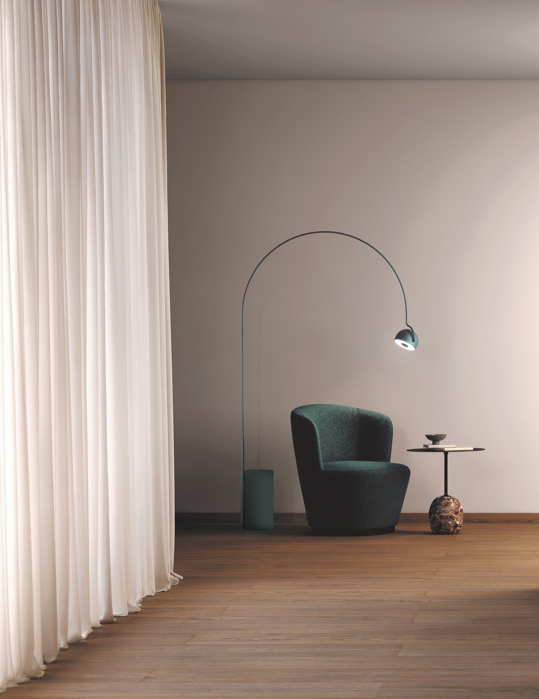 Напольный светодиодный светильник, состоящий из полусферического экрана и бетонного основания. Источник света регулируется по горизонтальной оси и излучает прямой и рассеянный свет. Доступны в металлизированной английской бронзе, матовой бирюзовой и матовой бежевой отделках.