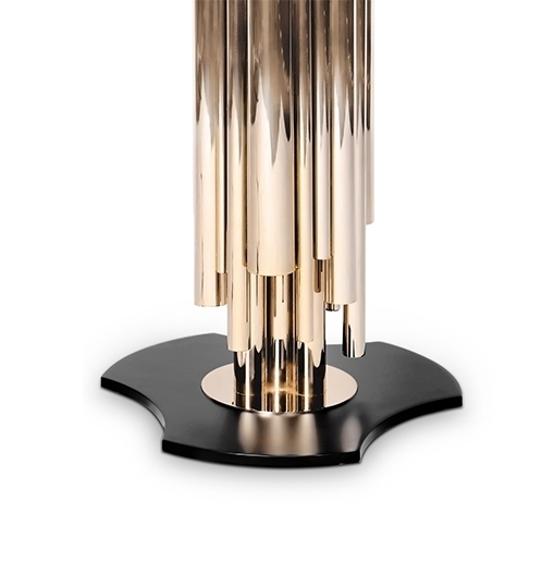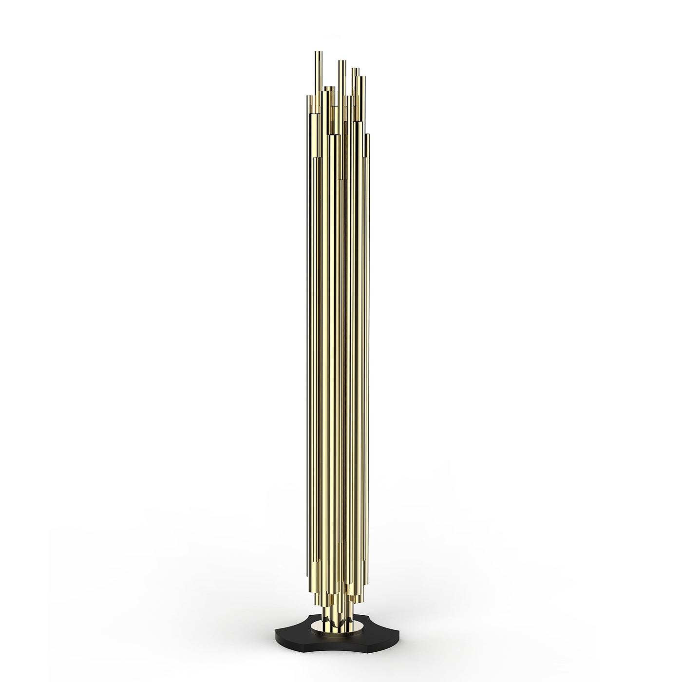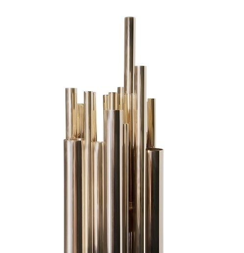 Торшер из коллекции Brubeck – стильный элемент интерьера. Тяжелый напольный светильник (около 22 кг), выглядит легким и воздушным благодаря множеству полых латунных трубочек разной длины, скрепленных между собой. Трубки покрыты лаком золотистого, серебристого или медного оттенка и установлены на темную устойчивую опору. Конструкционные особенности светильника обуславливают уникальный световой эффект, который позволит создать мягкое рассеянное освещение в выбранном вами участке дома.