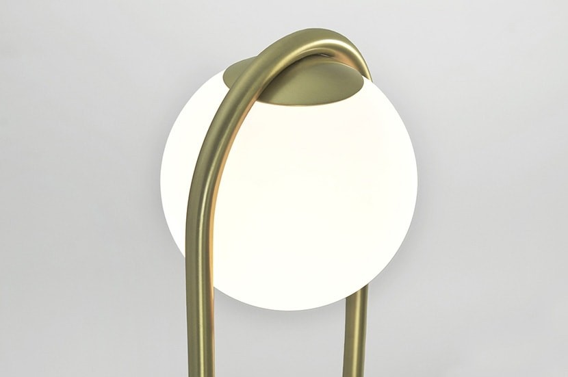 Напольный светильник состоит из опалового стеклянного шара и металлических деталей с отделкой из сатинированной латуни или черного матового цвета.