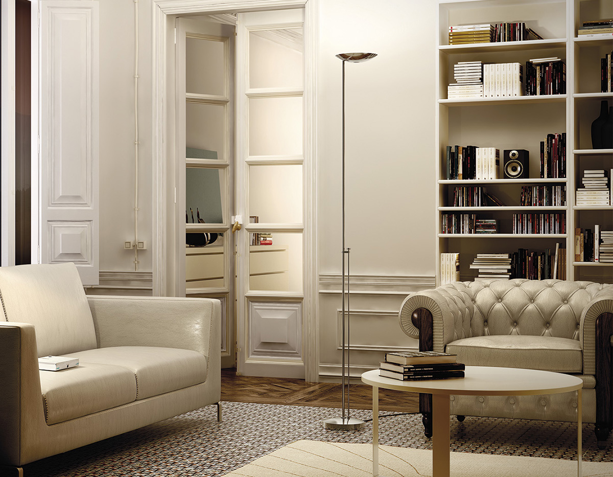 Стильный напольный светильник прямого и рассеянного света с диммером на уровне сидения для легкого доступа.