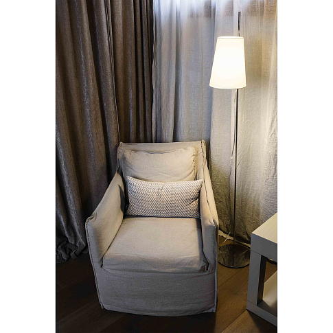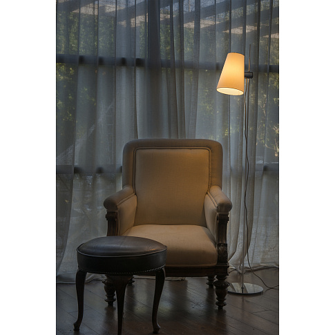 Торшер изготовлен из стали, абажур у него текстильный. Особо отметим элегантное решение — необычную деталь, соединяющую абажур и источник света. Абажур можно двигать вверх-вниз, оптимизируя локальное освещение. Для полноценной работы прибора вам понадобится лампочка E27 MAX 20W.