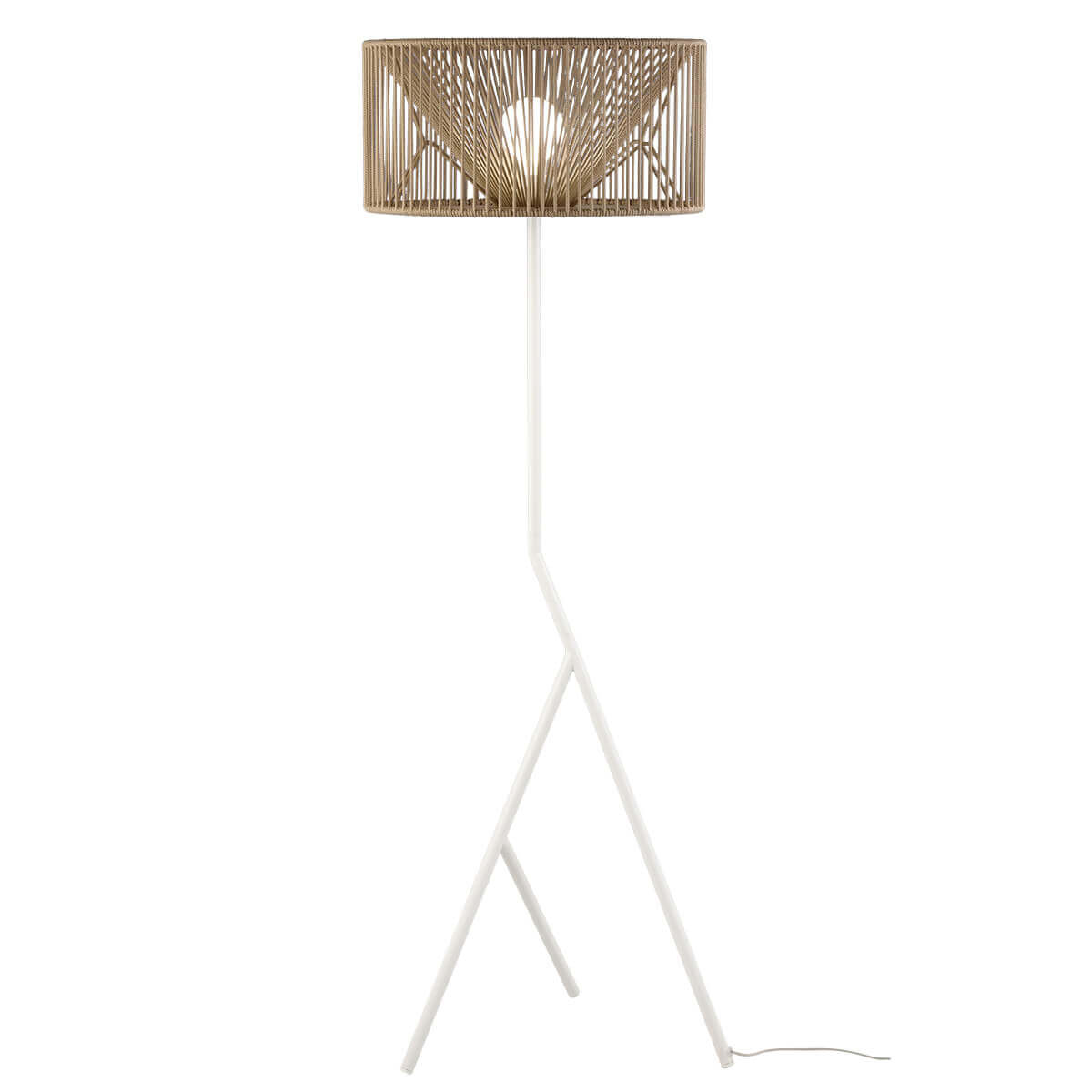Надежный торшер с абажуром диаметром 50 см из плетеного шнура ручной работы из переработанных пластиковых бутылок , доступных в широкой цветовой гамме, с оригинальным металлическим штативом белого или черного цвета. - Лампочка в комплект не входит (1 светодиод E27). - Плетение шнура: 75 метров.
