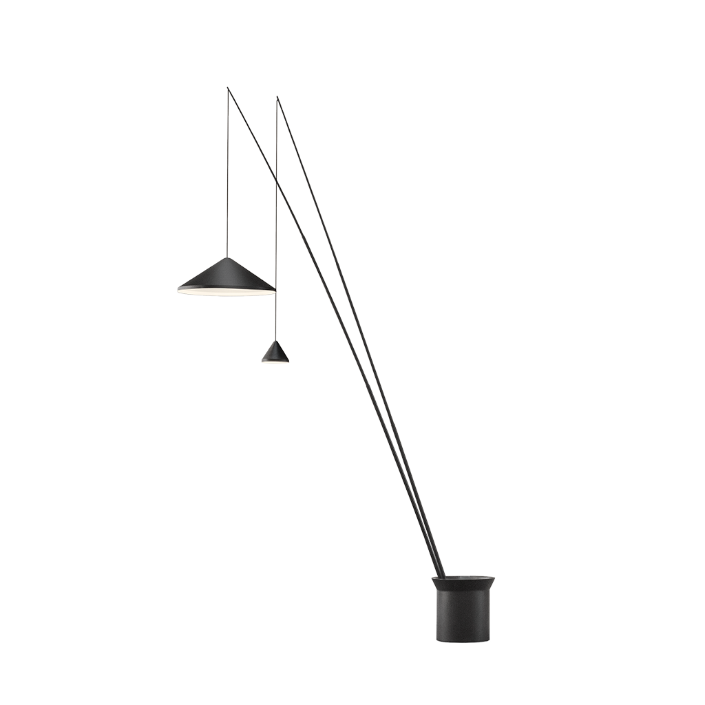 Торшер. Дизайн Арика Леви. Два плеча поднимаются из основания, чтобы подавать свет туда, где он нужен пользователю. Угол наклона стержней регулируется. Основание украшено черными камнями. Электронная кнопка управления. Светодиодный источник света.