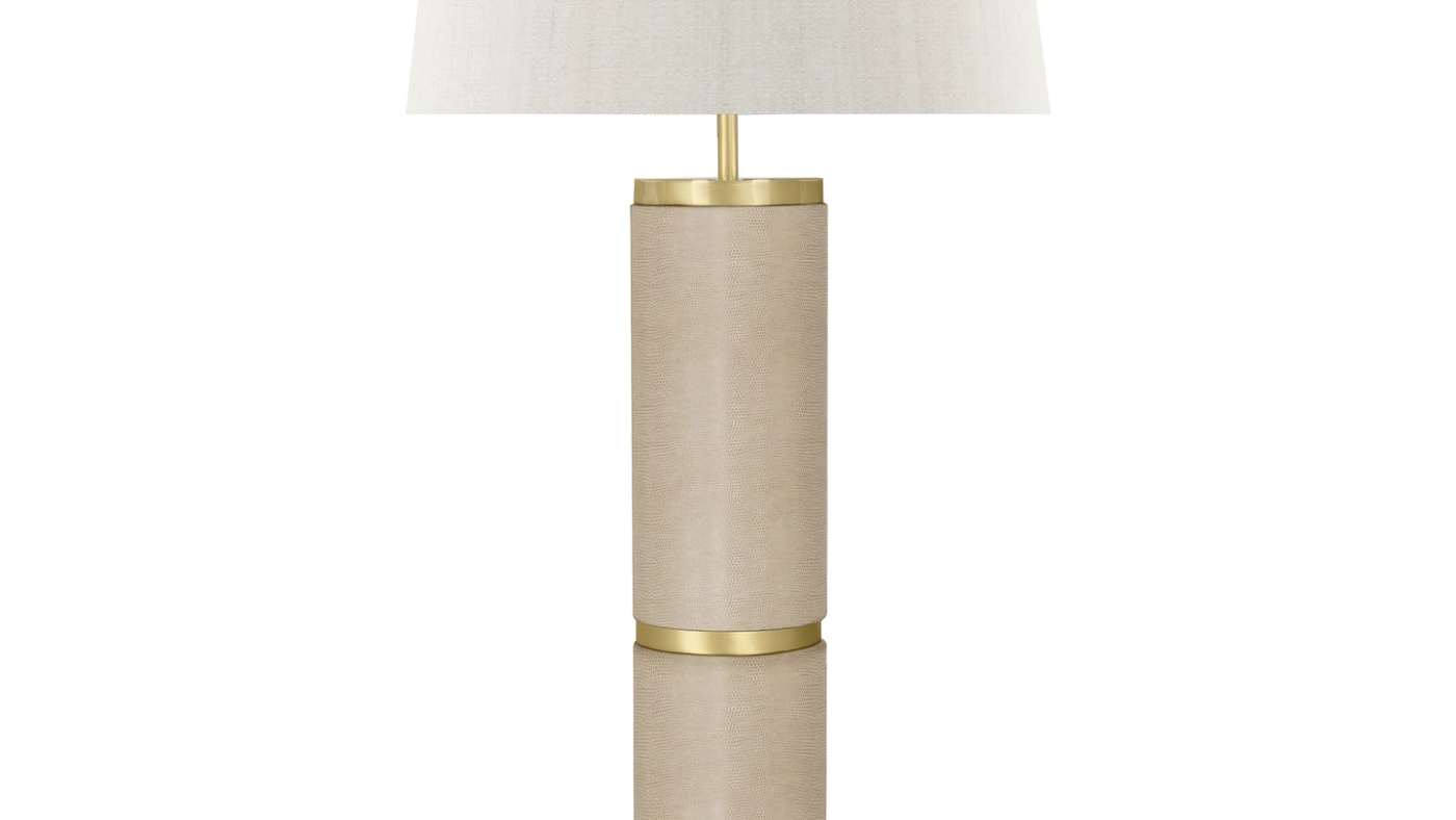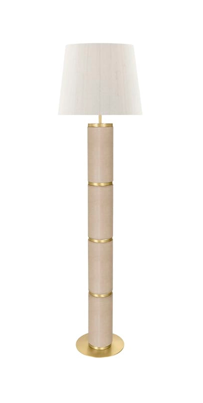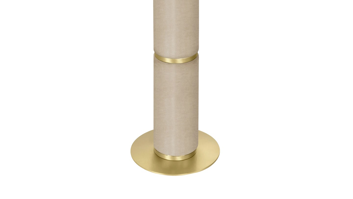 Напольный светильник WOMAN обязан своим статуарным пропорциям высокому основанию в виде тотема, на котором чередуются секции из структурированной кожи и матовой латуни. Это уравновешивается щедрым двойным шелковым оттенком и тонкой круглой основой.