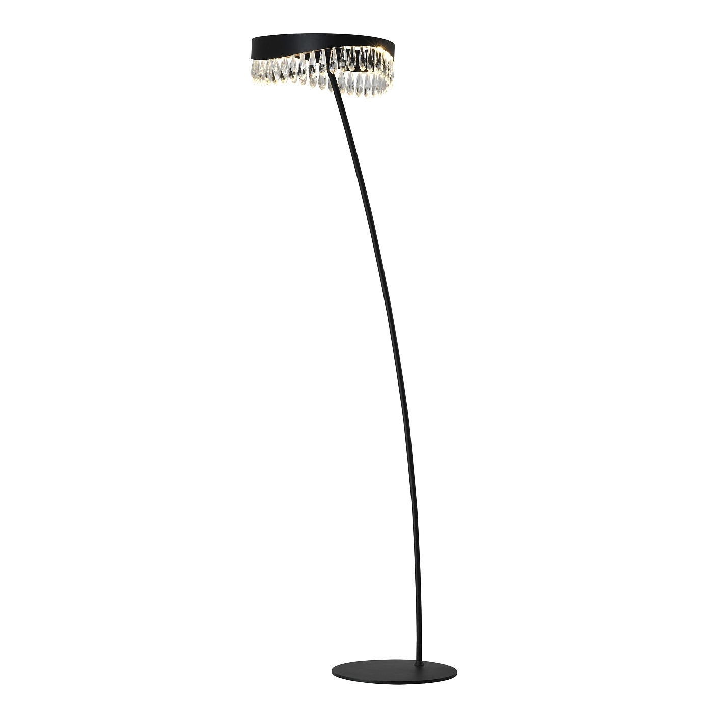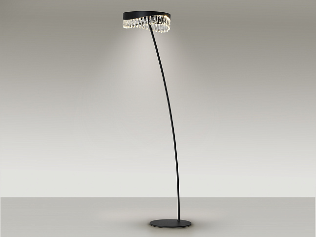 Торшер из металла и алюминия, окрашенный в черный матовый цвет. Рассеиватель из граненых хрустальных капель. Светодиодное освещение 20Вт, 800Лм, 3000К.