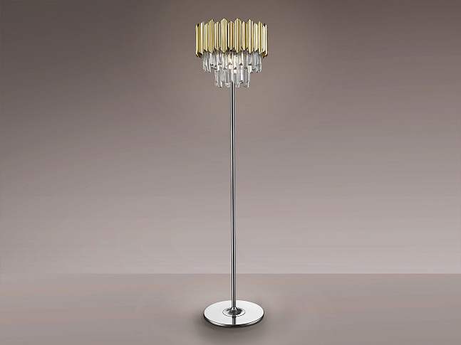 Торшер из металла, хромированная отделка. Абажур из граненых стеклянных призм с деталями из АБС-пластика с позолоченным покрытием. ·В комплект поставки входят 3 светодиода G9 мощностью 6 Вт.