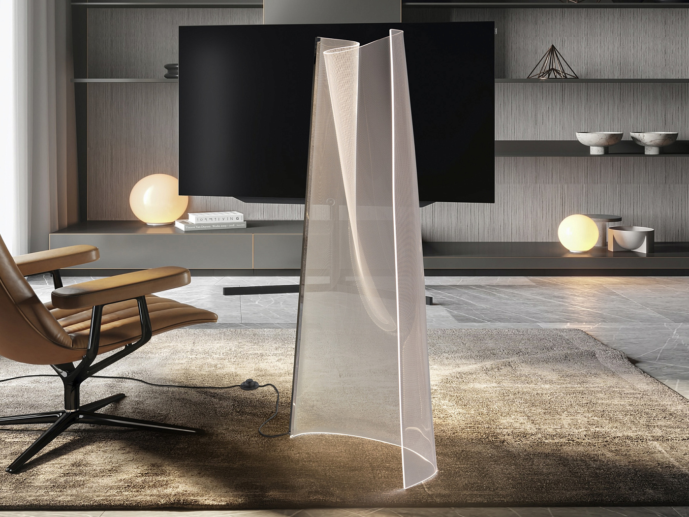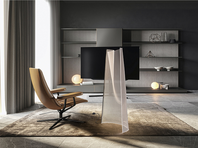 Напольный светильник, состоящий из листа формованного микропечатного метакрилата и хромированного металлического профиля. Светодиодное освещение 24 Вт, 1500 лм, 3000 К.