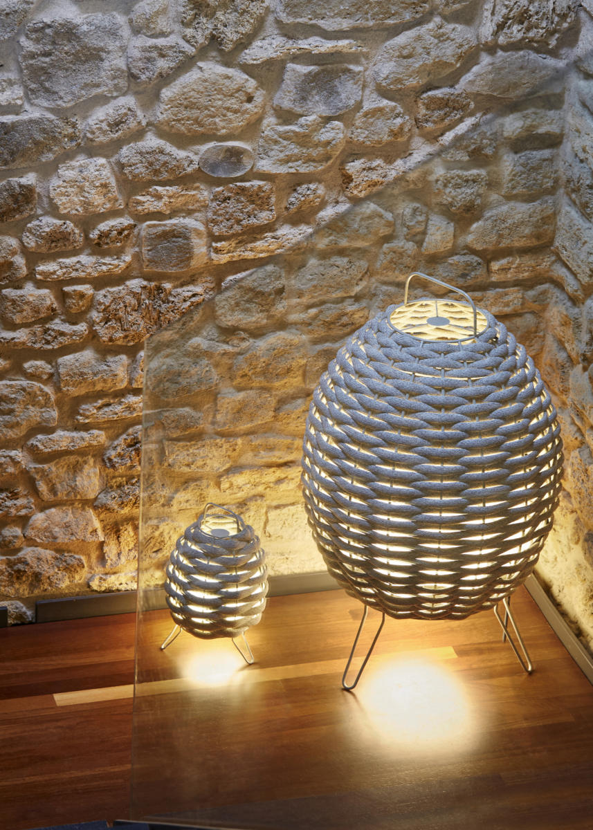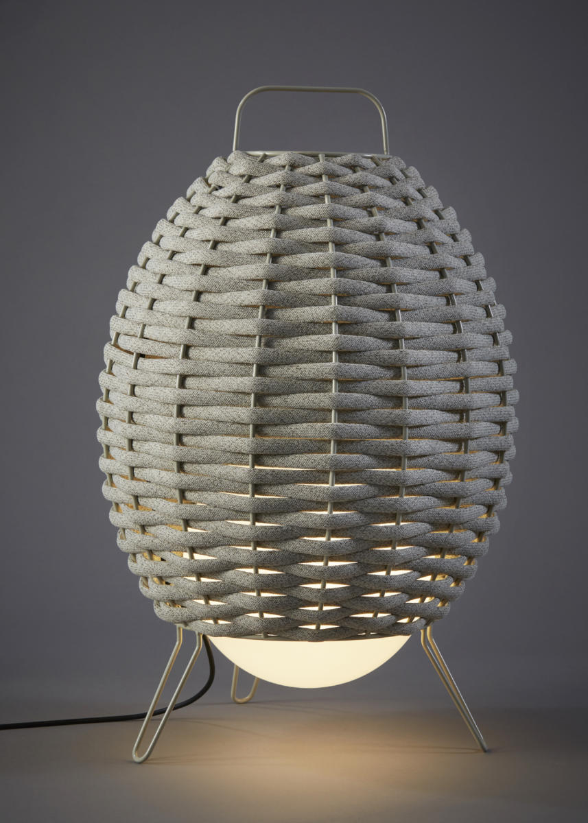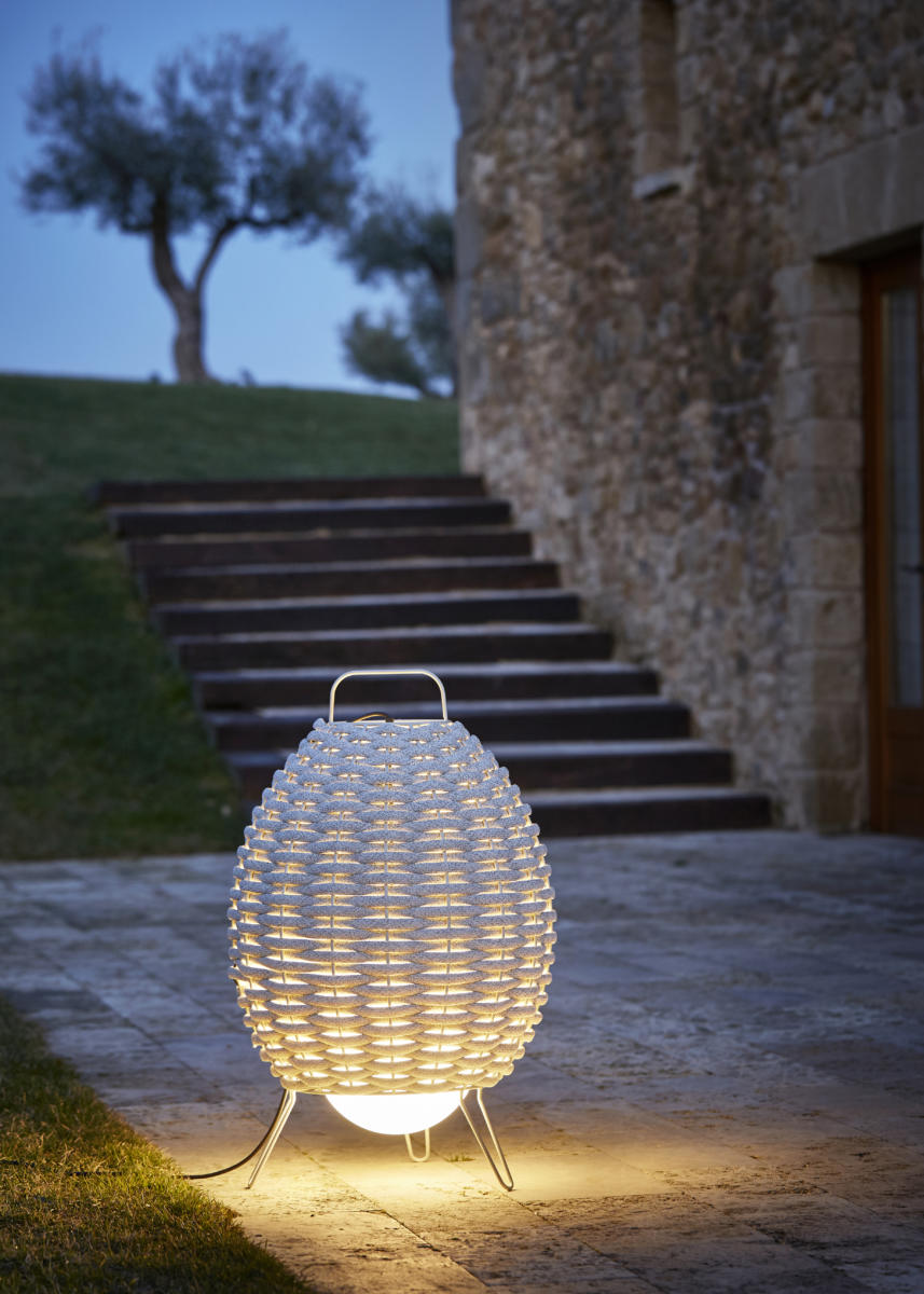 Металлический каркас с обработкой снаружи (нанофорез). Отделка серого цвета (RAL7032). Плетеный абажур из текстильного материала, обработанного УФ-излучением. Два размера роста: 110 и 78 см В комплект входит светодиодная лампа. Он отличается своей органической формой и теплотой светового пятна на своих экранах. Все они имеют форму эллиптического шара, оплетенного неопреном, покрытым решетчатой тканью.
