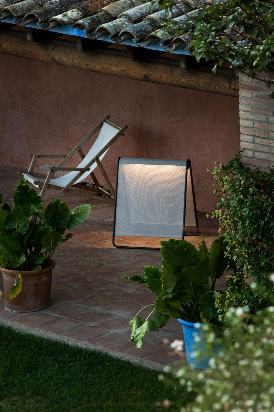 CADAQUÉS - это напольный торшер, разработанный Faro Lab. Его структура напоминает треугольник, а теплый луч света проецируется прямо из середины двух плафонов. Он изготовлен из алюминия и текстиля, высококачественного материала, который очень хорошо сопротивляется перепадам температур, а также используется для изготовления пляжных шезлонгов. У него есть аксессуар для крепления лампы к земле и один для увеличения длины кабеля. Также в синей отделке.