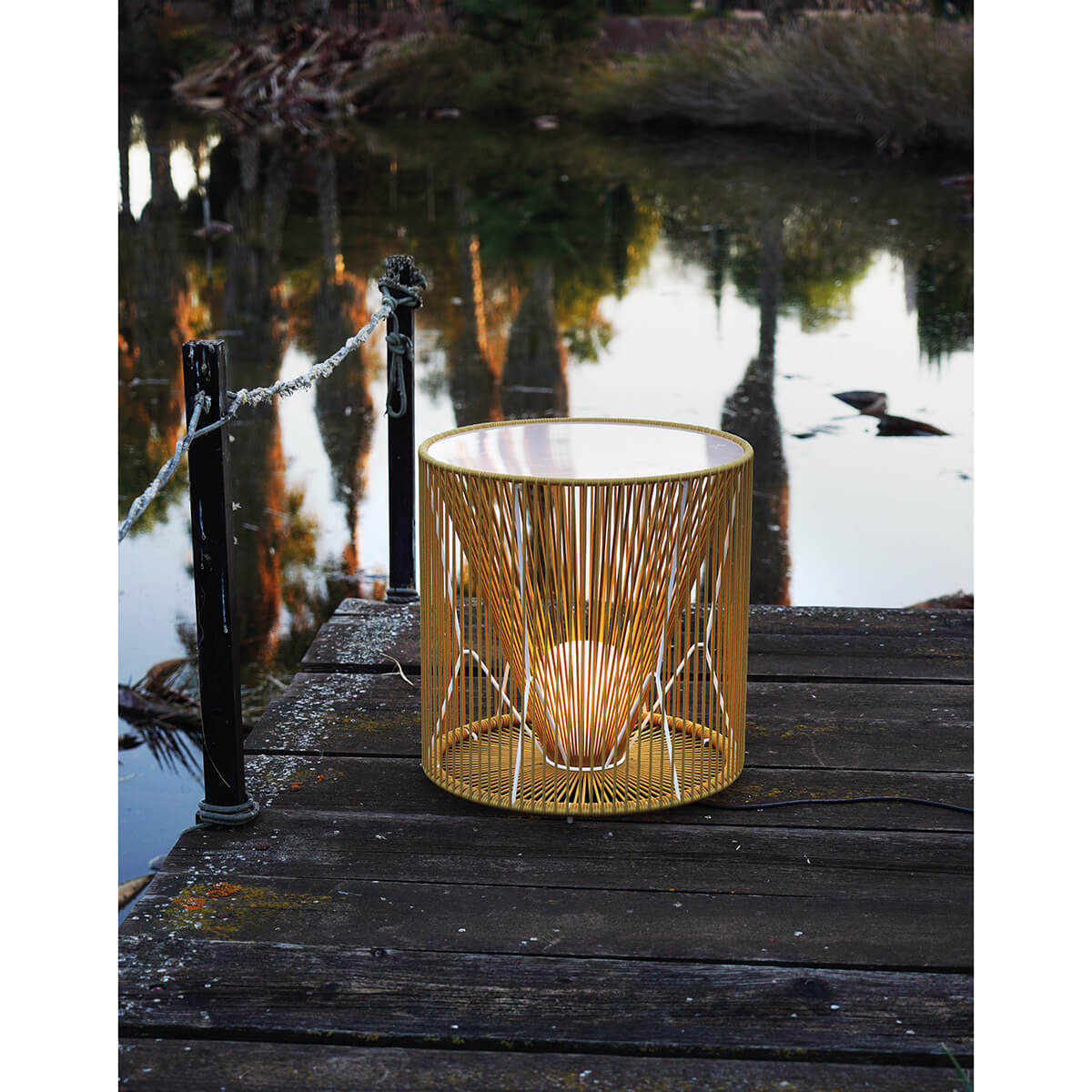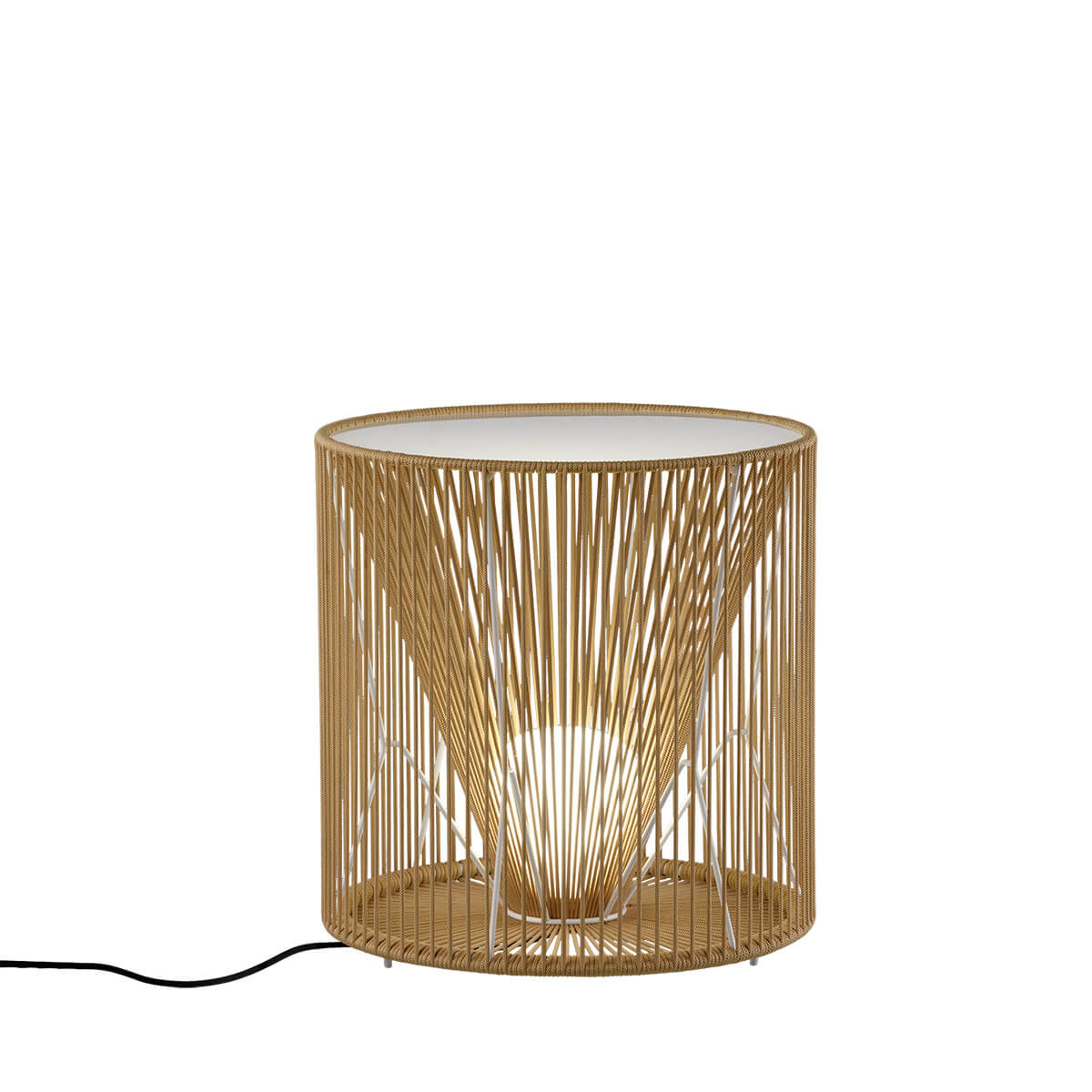Торшер с абажуром диаметром 50 см из плетеного вручную шнура из переработанных пластиковых бутылок . IP66 для использования на открытом воздухе. - Лампочка в комплект не входит (1 светодиод E27). - Плетение шнура: 117 метров.