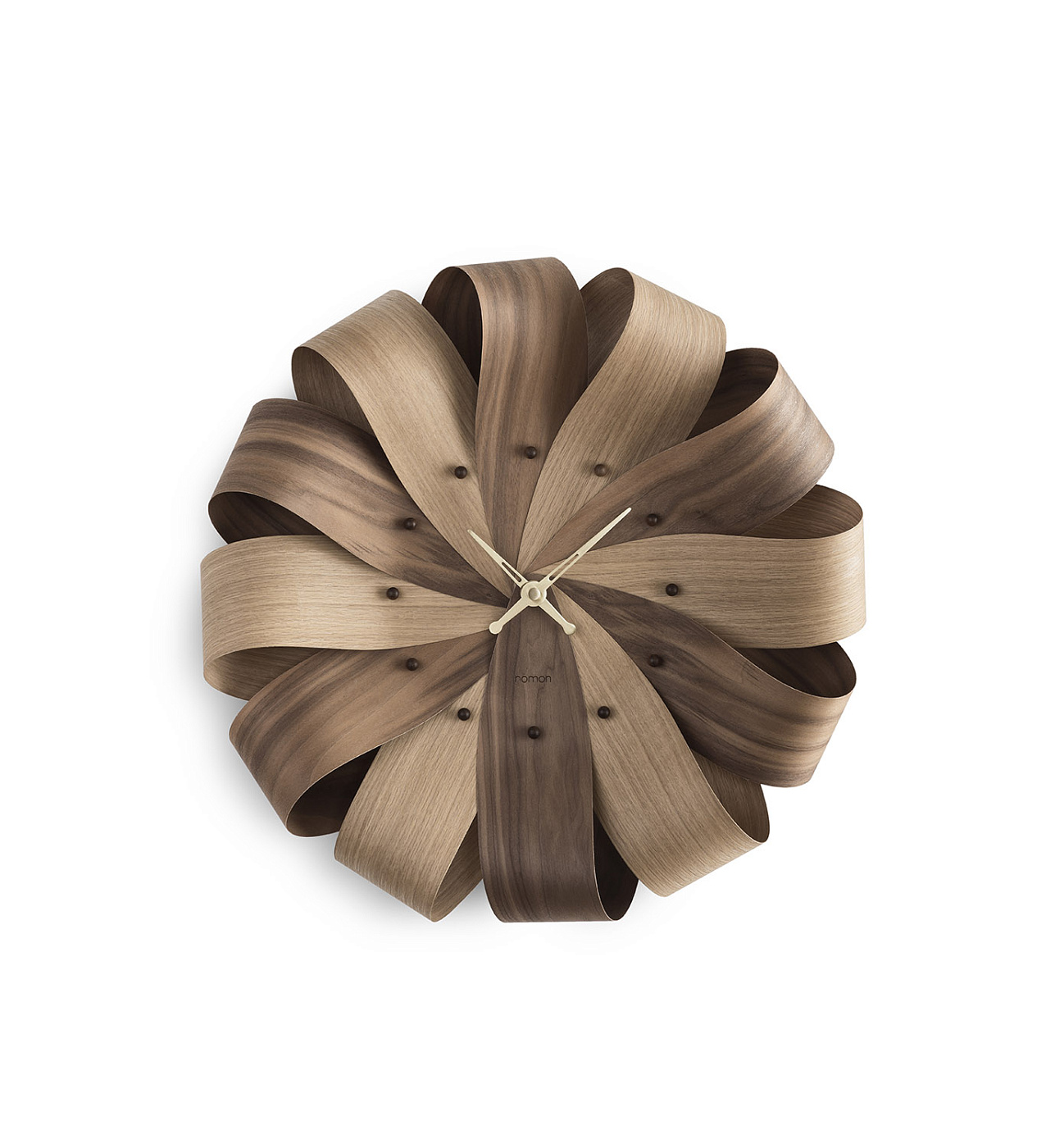 Оригинальные настенные часы от Nomon выполнены в форме цветка. Сам циферблат может быть полностью из шпона дуба или американского ореха или сразу из двух видов шпона. Стрелки могут быть из массива ореха или дуба, а также из полированной латуни. Часы работают от стандартной батарейки типа АА.