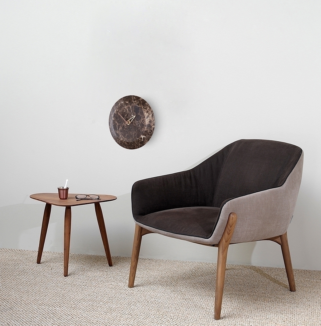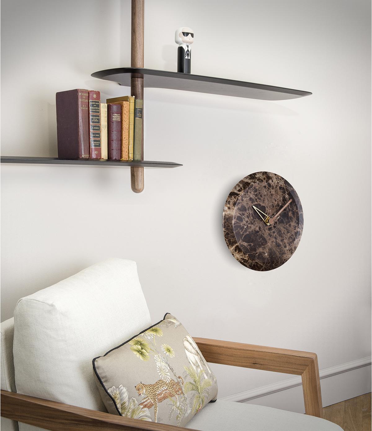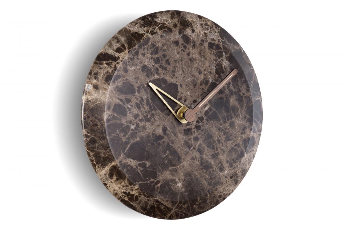 Настенные часы, выполненные из массива дерева,окрашенного под орех и мраморной пластины цвета Emperador. В этой коллекции главным героем является мрамор, который в сочетании с ореховыми шпилями и полированной латунью возводится в ранг скульптуры.