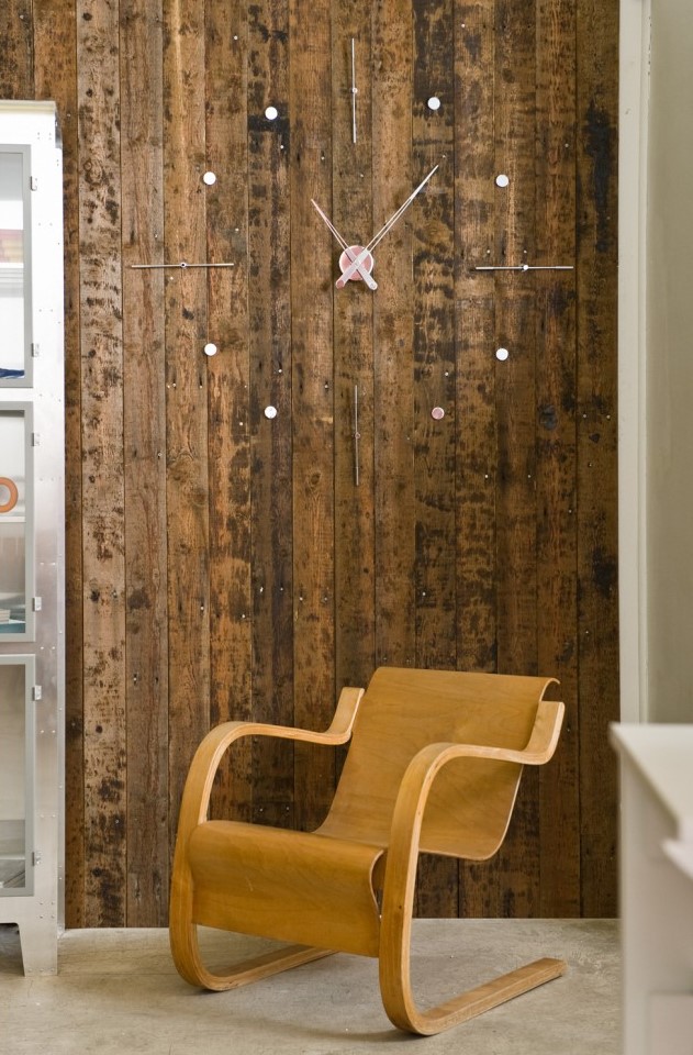 Часовые деления крепятся прямо на стену, а часового механизма от немецкой фирмы UTS почти не видно. Стрелки парят над стеной, исправно отсчитывая минуты. Воплощённая метафора текучести времени.