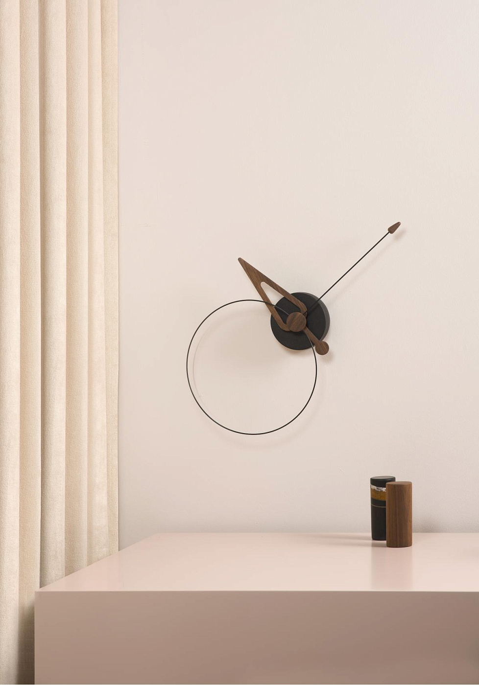 Авангардный дизайн в скандинавском стиле, сочетающий отделку из орехового дерева или дуба с черными и белыми цветами. Стрелки из орехового дерева и черного стекловолокна, коробка из черного полистирола.