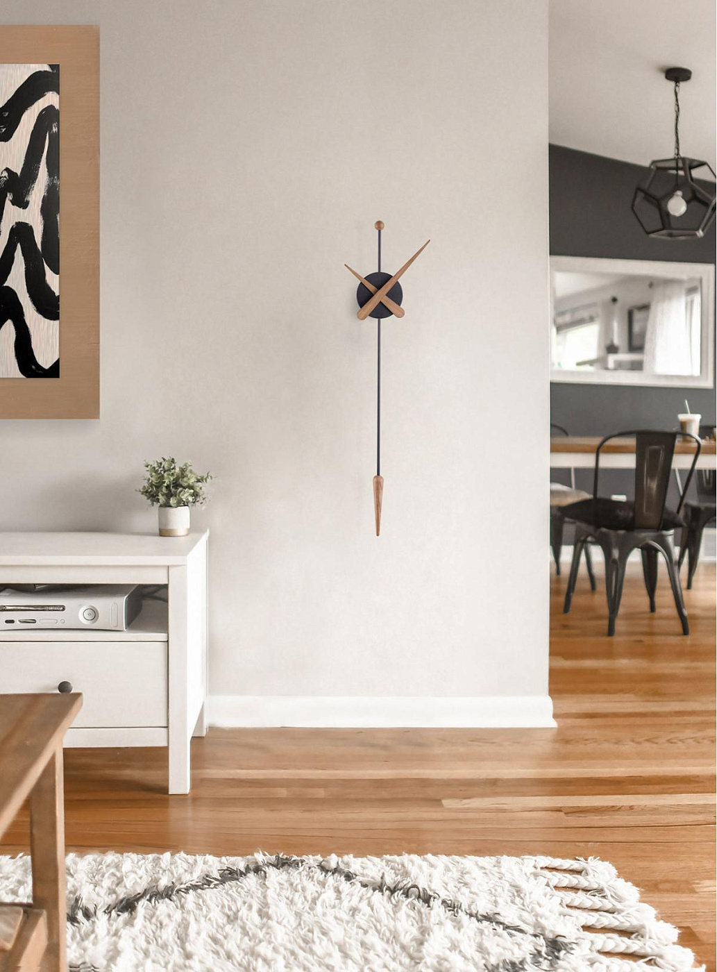Дань уважения классическим маятниковым часам с обновленной эстетикой. Сочетает в себе отделку из орехового дерева или дуба с черным или белым стекловолокном. Стрелки и маятник с отделкой из дуба, коробка из черного полистирола.