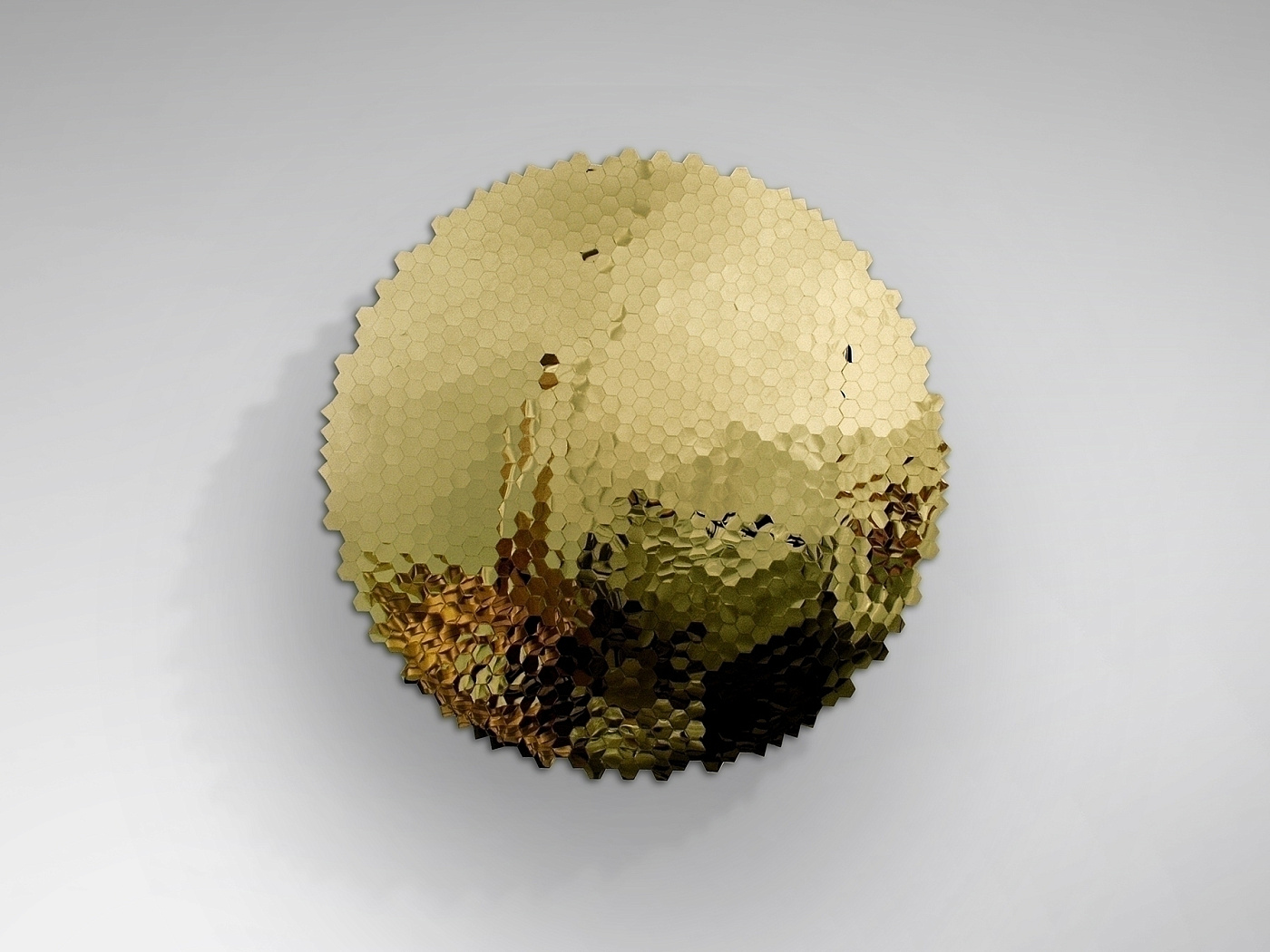 Барельеф из листов нержавеющей стали, образующих сферическую сетку многогранников. Отделка блестящая позолоченная.