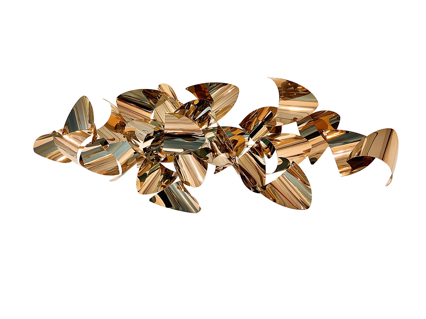 Настенная скульптура из листа нержавеющей стали, композиция из изогнутых деталей с покрытием из розового золота. Готова для подвешивания в горизонтальном и вертикальном положениях.