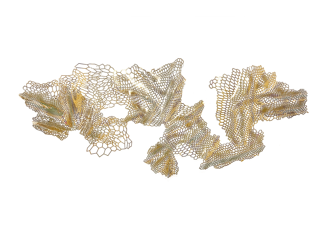 Настенная скульптура, изготовленная из листа нержавеющей стали, с перфорированным и формованным геометрическим сетчатым рисунком. Блестящая позолоченная отделка.