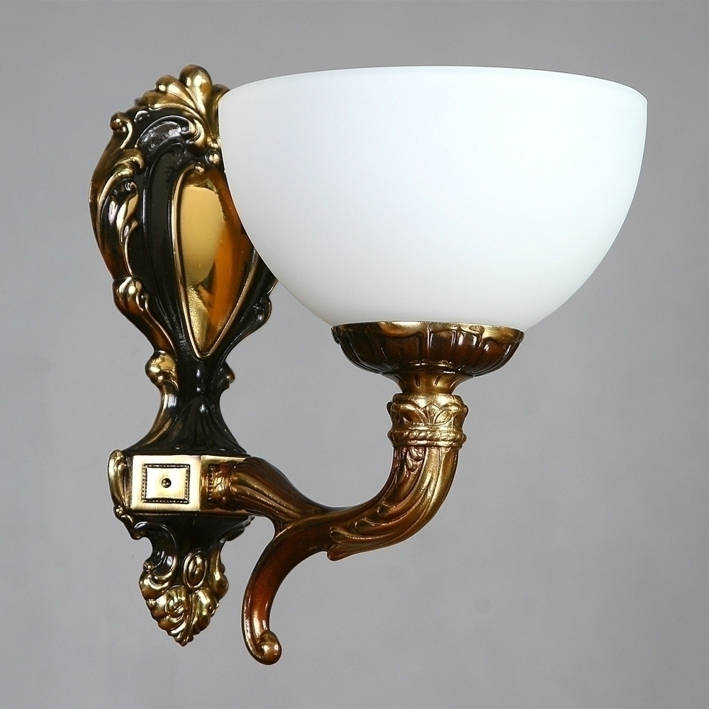 Настенный светильник, выполненный из латуни в блестящей бронзовой отделке и плафоном из стекла белого цвета.
