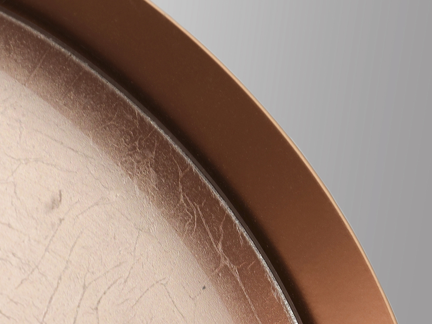 Зеркало из металлических колец, покрытых розовым золотом, с зеркальными дисками или стеклом с фоном из листьев розового золота. Можно повесить горизонтально или вертикально.