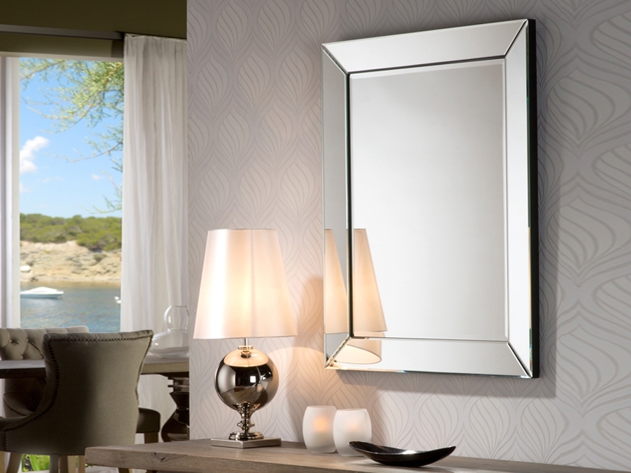 Зеркало с фаской в раме из зеркальных полотен с фаской на основе из дерева и MDF. Подготовлено для установки в горизонтальном или вертикальном положении.