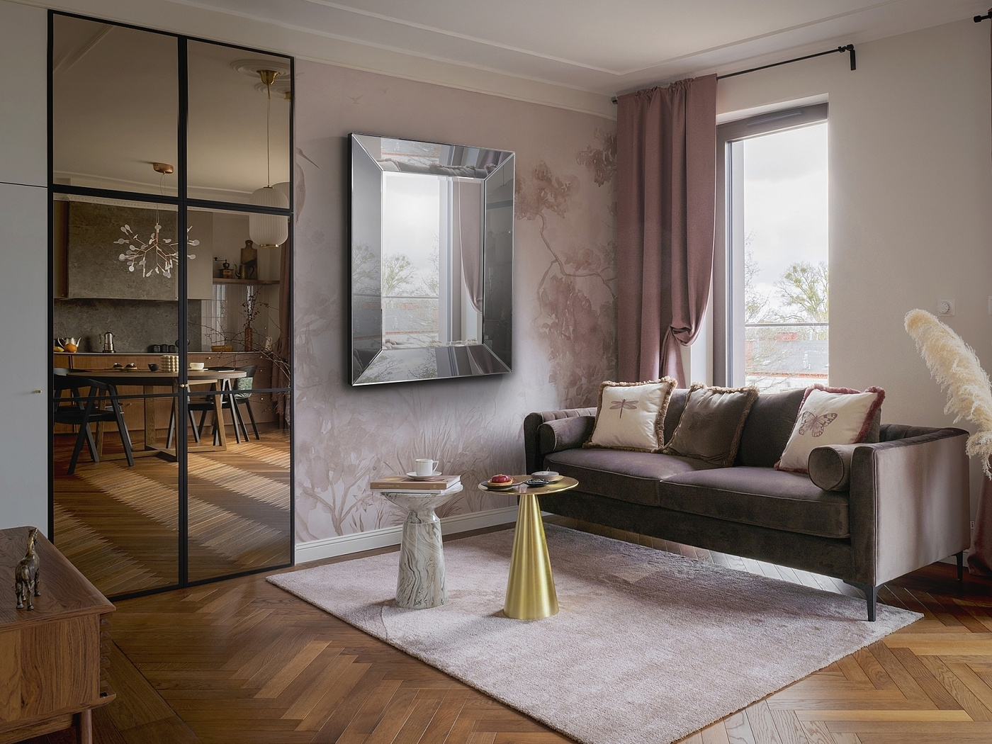Декоративное зеркало изготовлено из скошенных зеркальных пластин. Рама дымчатого цвета. Задняя часть выполнена из МДФ чёрного цвета. Готово к установке в вертикальном или горизонтальном положении. Рамка дымчатого цвета, ширина 15 см.