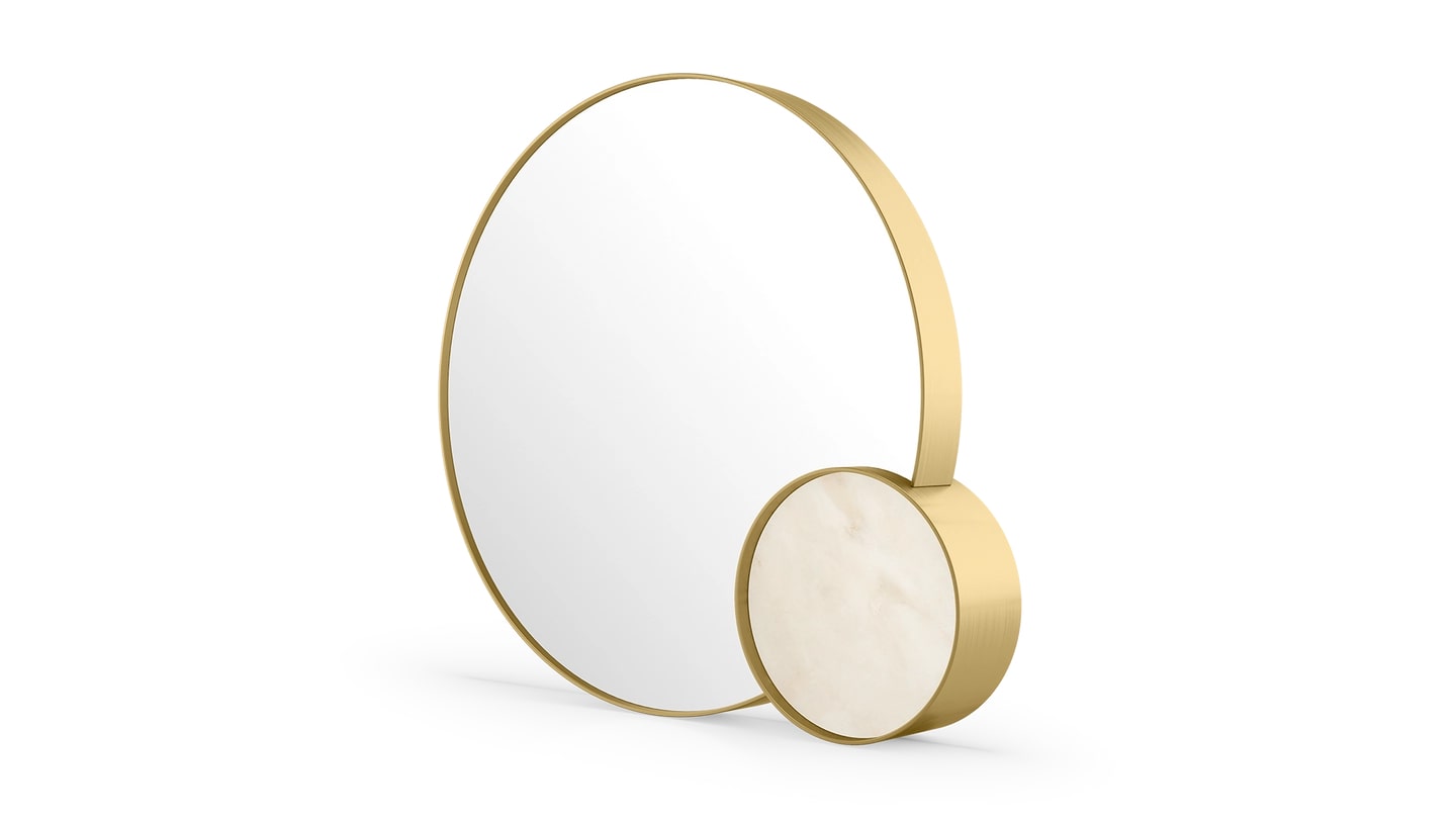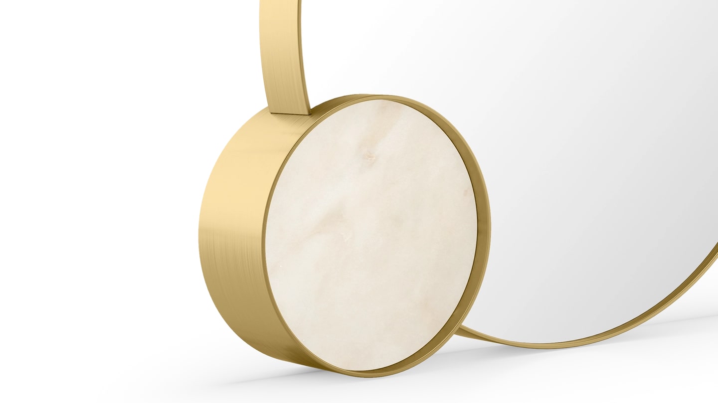 Эргономичная форма изысканного настольного зеркала AMALFI приобретает особую чувственность благодаря дополнению меньшего перекрывающего круга, инкрустированного мрамором. Бесшовная отделка из матовой латуни обеспечивает безупречную отделку, привнося гармонию в целое.