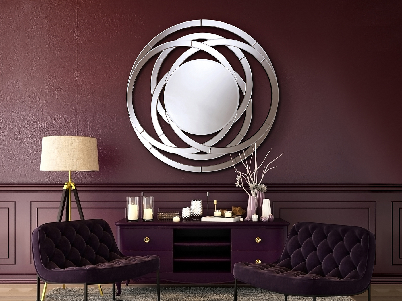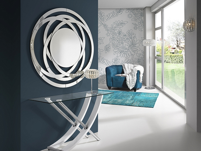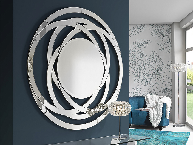 Зеркало круглое с фаской в ажурной раме в виде колец, составленных их изогнутых зеркал с фаской, на основе из дерева чёрного цвета.
