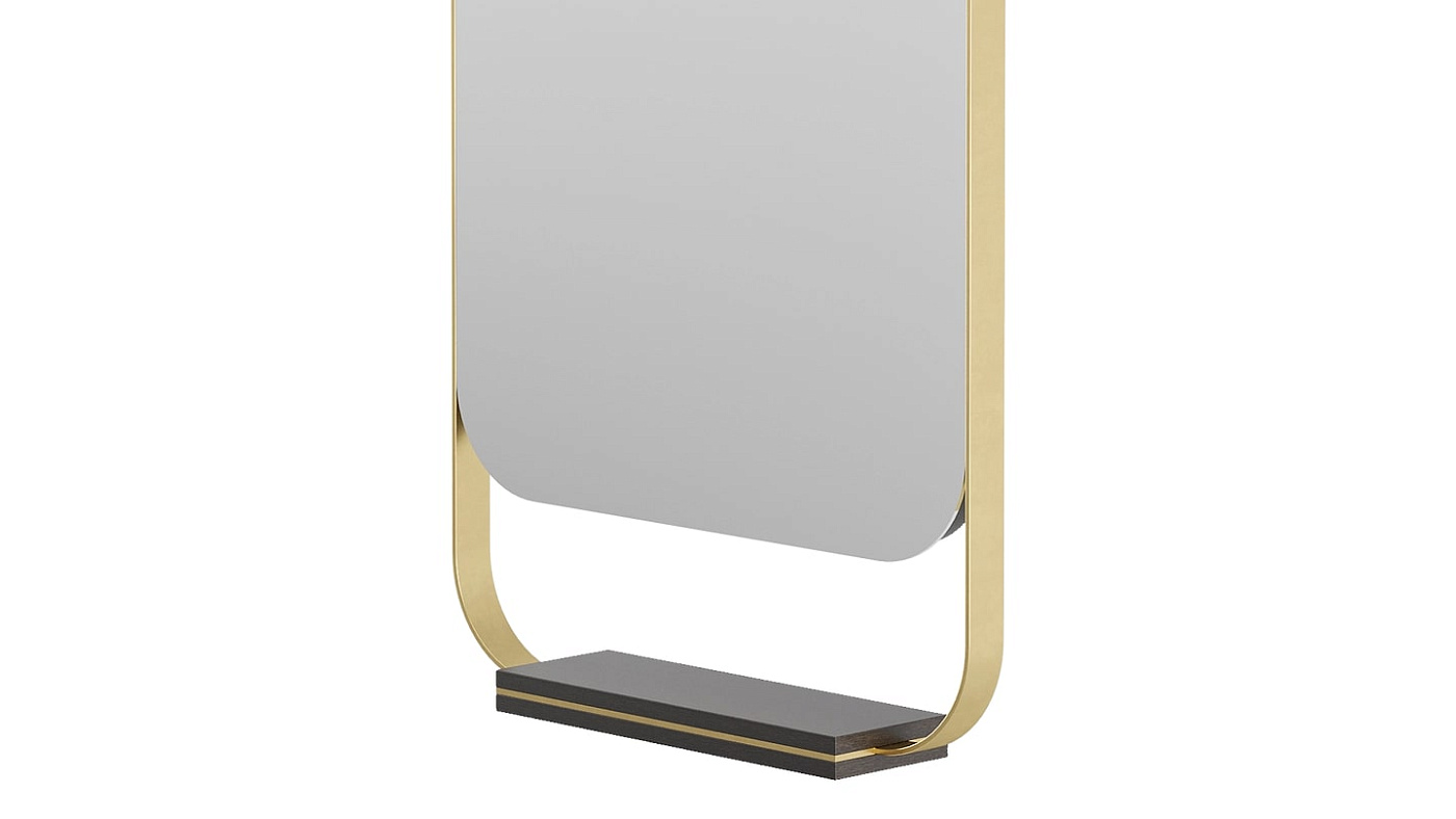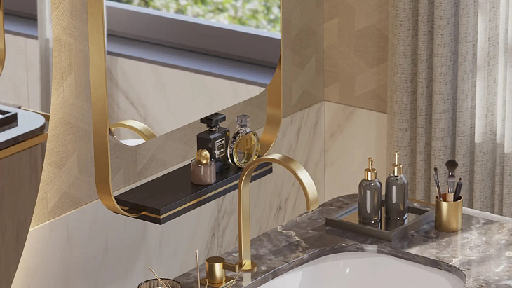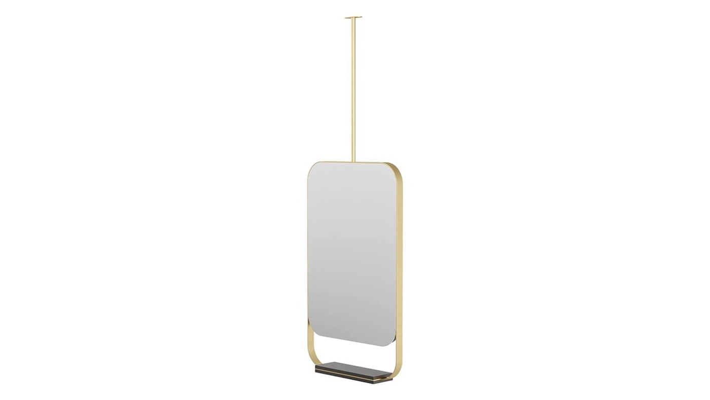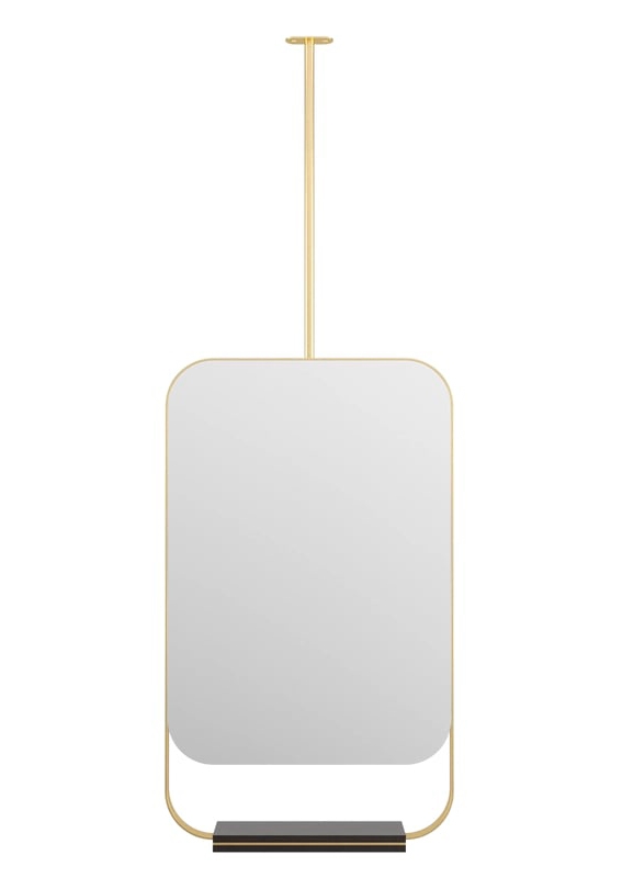 Зеркало BONDI, отличающееся тонкой латунной рамкой, в которую встроена небольшая деревянная полка, можно подвесить к потолку, что обеспечивает вам большую универсальность при планировке ванной комнаты.