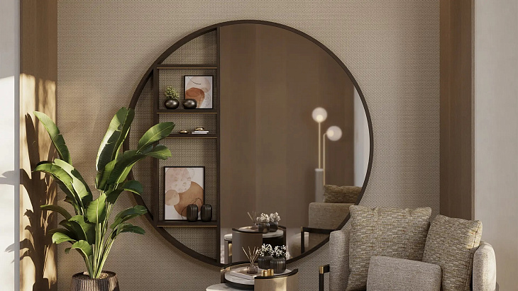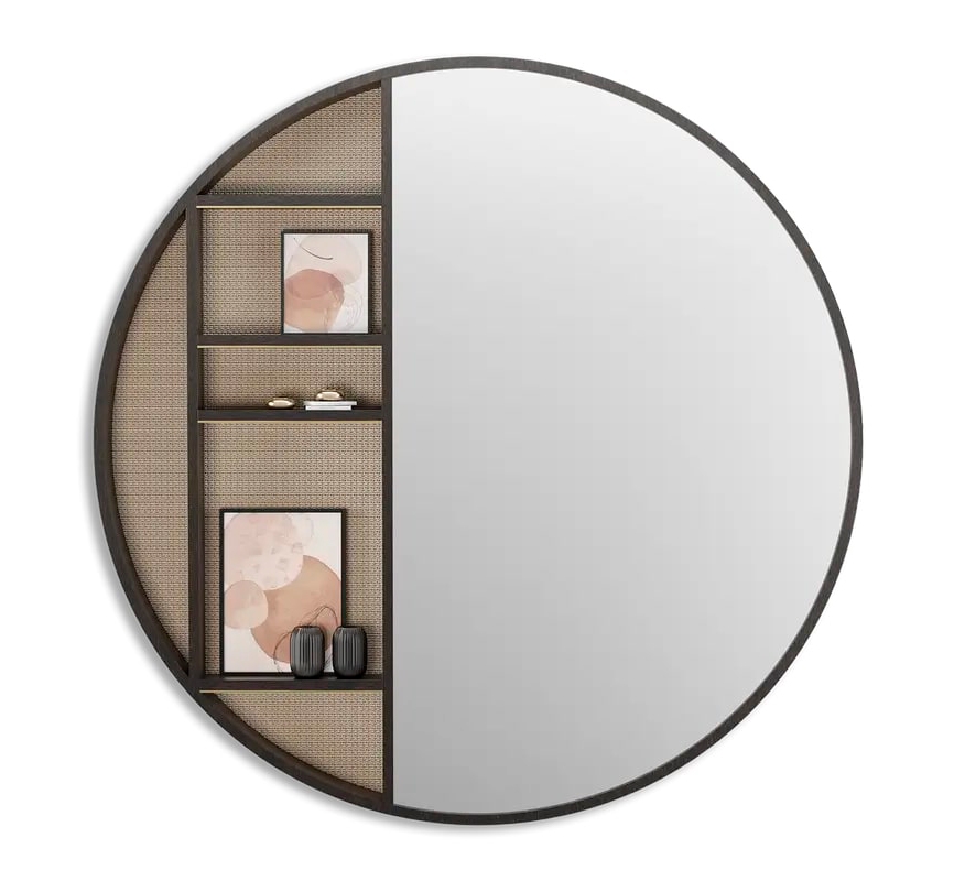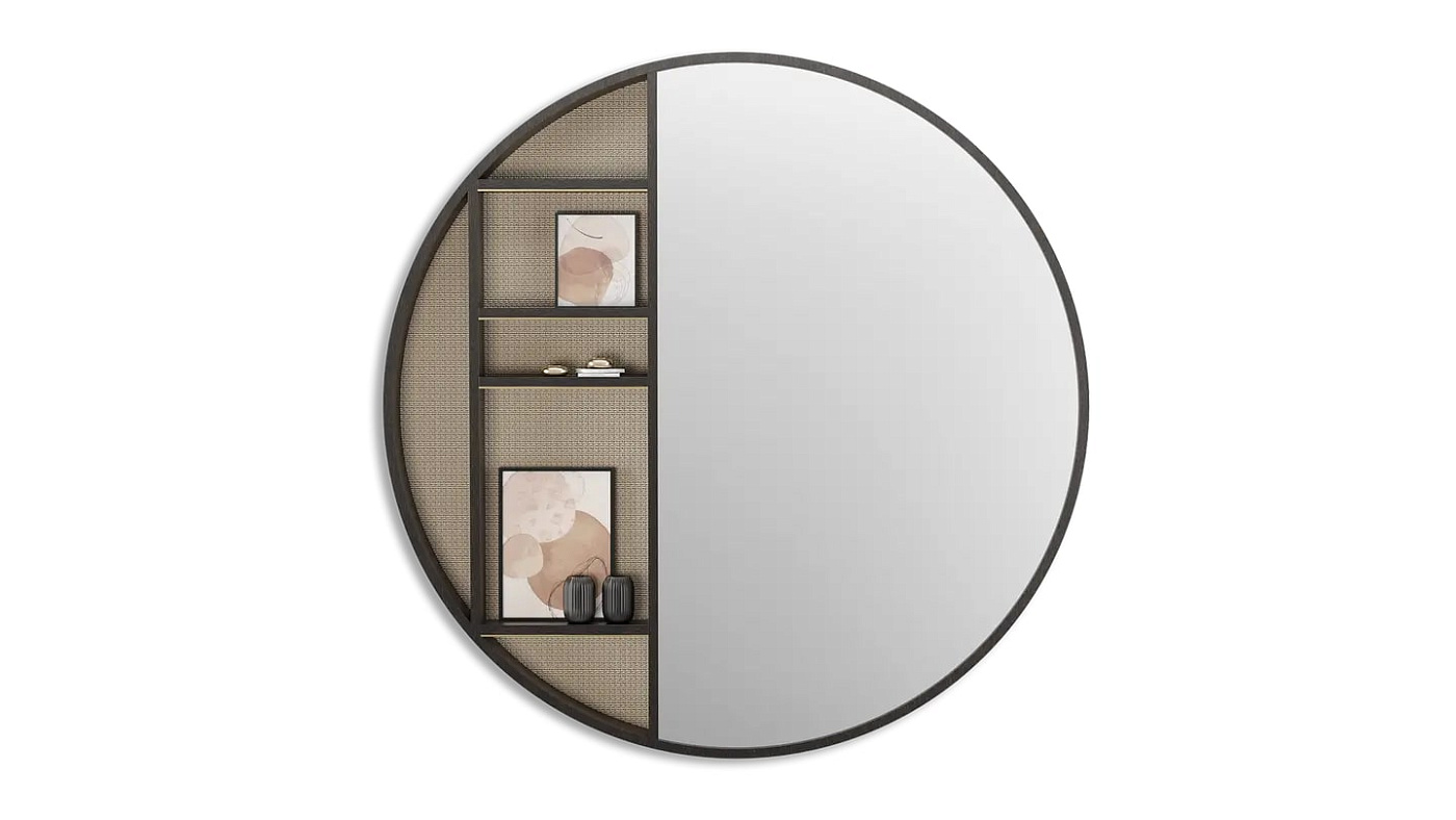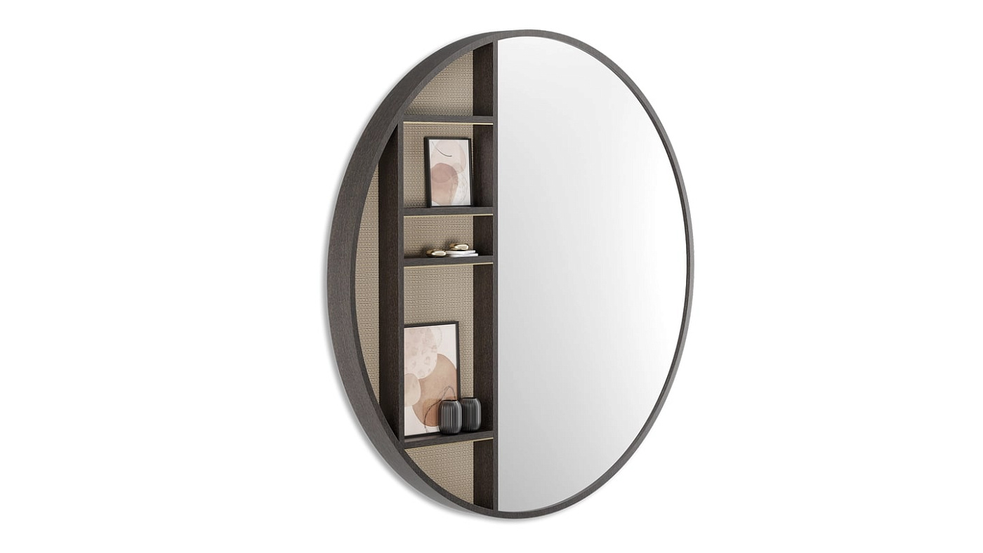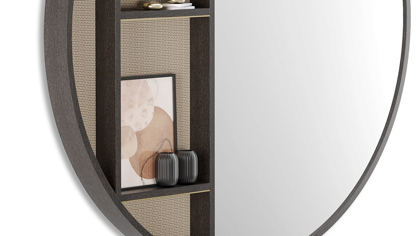 Частично зеркало, частично дисплей - негабаритный шкаф BRENTWOOD создан для того, чтобы производить впечатление. Тонкие полки, идеально подходящие для демонстрации украшений или подпирания произведений искусства, изготовлены из деревянного шпона, оклеены обоями и украшены матовой латунью.
