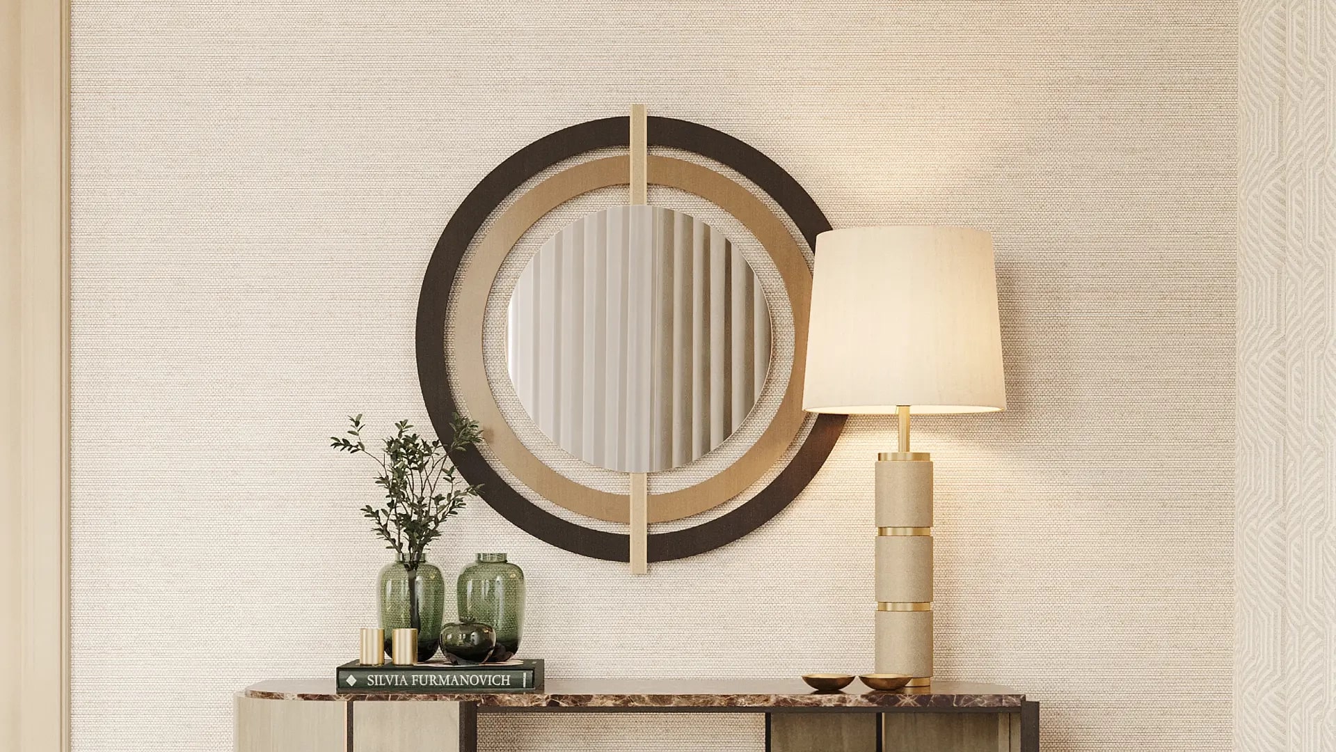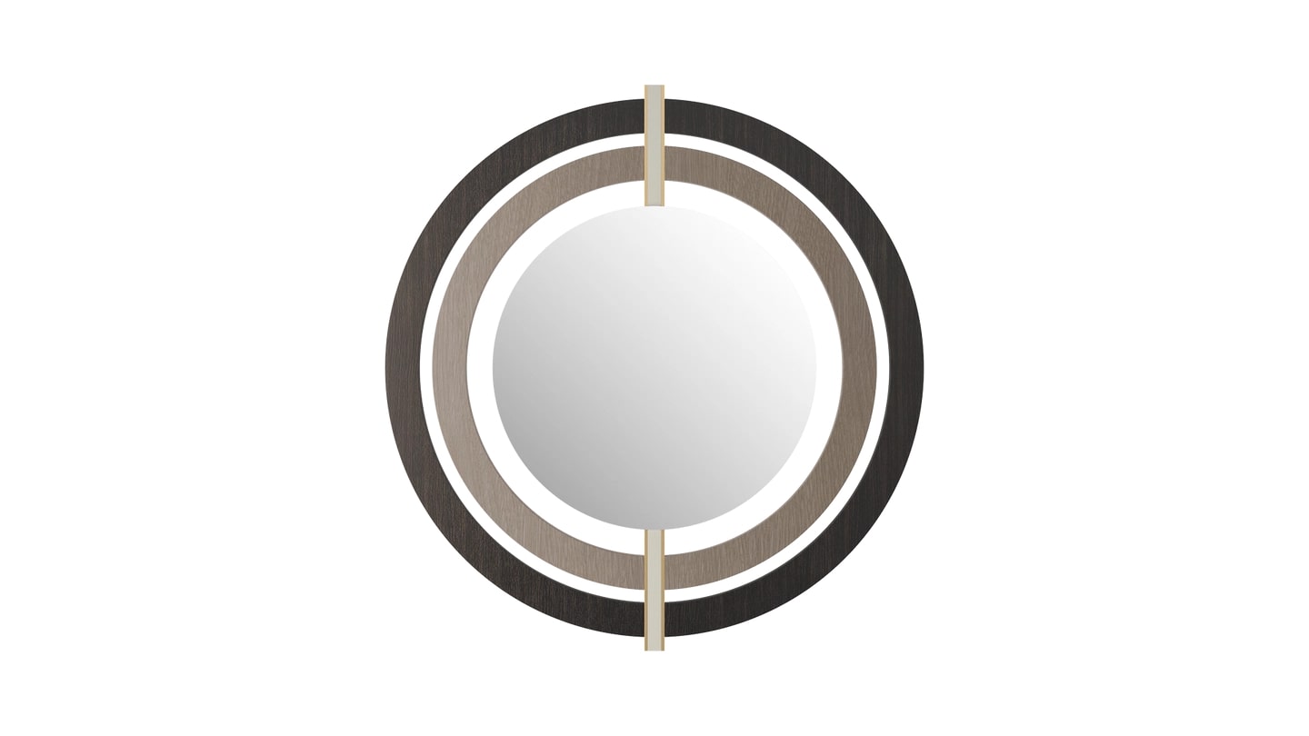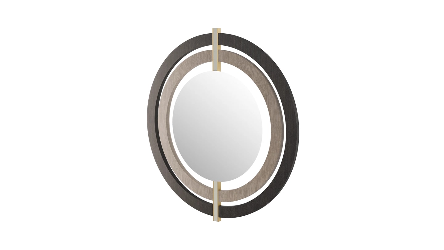 Серия аккуратных концентрических кругов создает эффект ряби вокруг центрального зеркала, висящего на стене в БРЕШИИ. Обманчиво простой дизайн сочетает в себе повышенную материальность, которая включает в себя кожу, латунь и деревянный шпон.