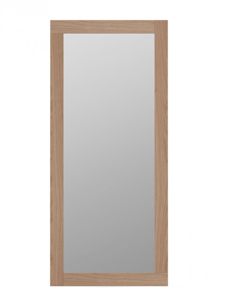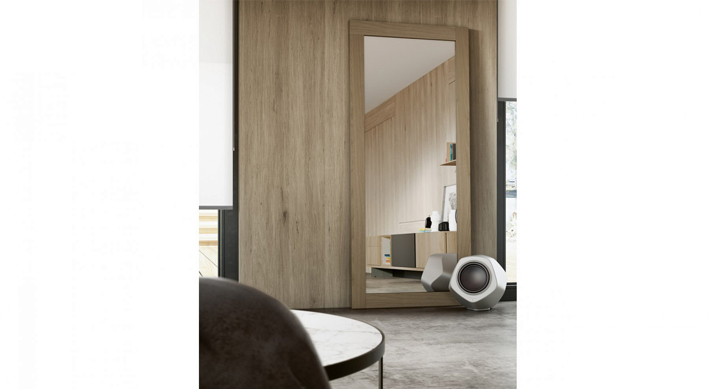 Соединительное зеркало основано на серии абсолютно прямых геометрических соединений. Деревянные вставки подчеркивают горизонтальные и вертикальные линии.