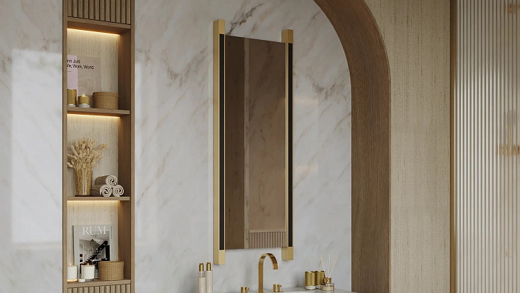 Простое, но в то же время эффектное зеркало GALWAY привлекает внимание своей угловатой формой. Матовые латунные вставки со вставками из деревянного шпона придают дизайну элегантность.