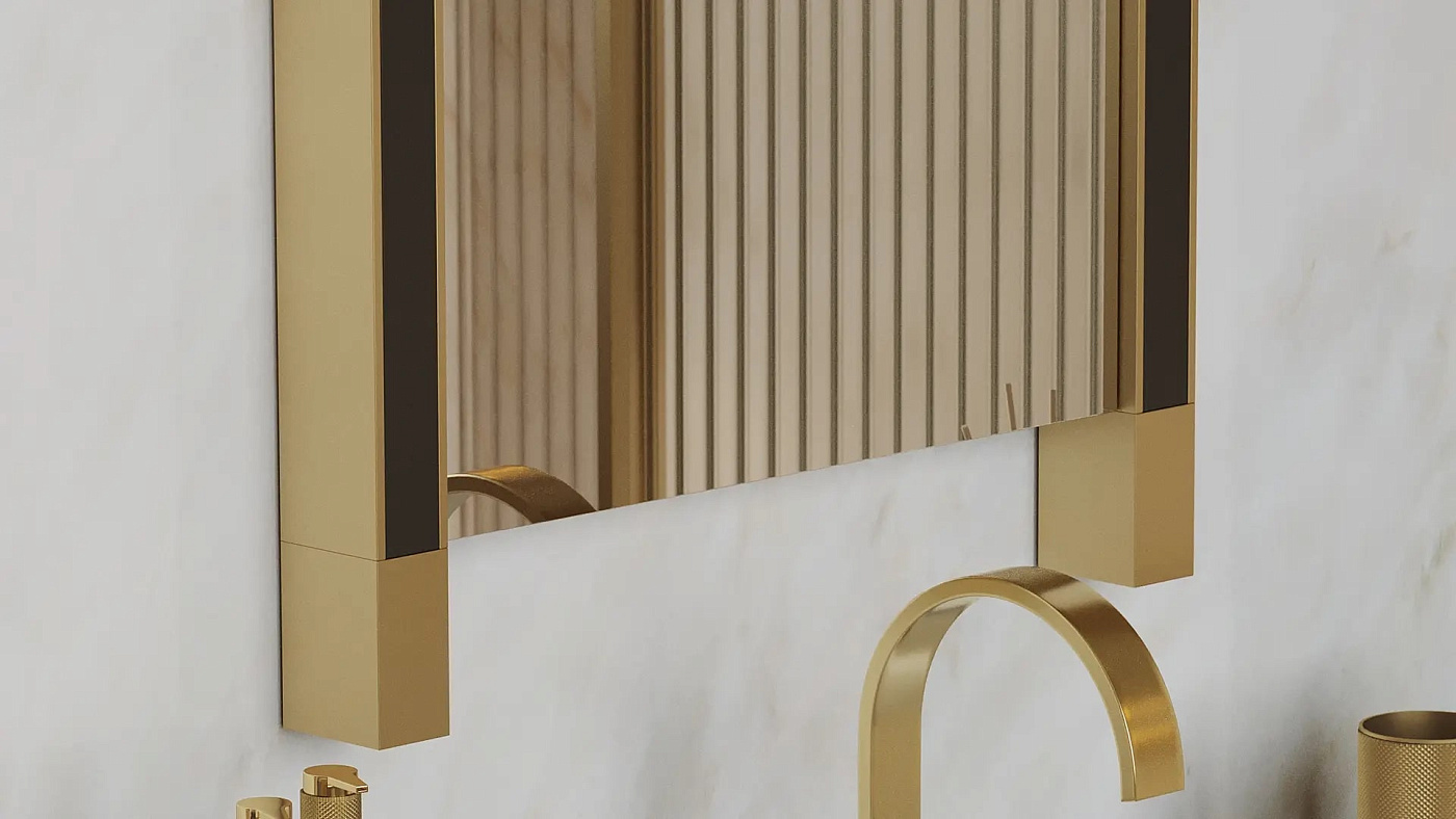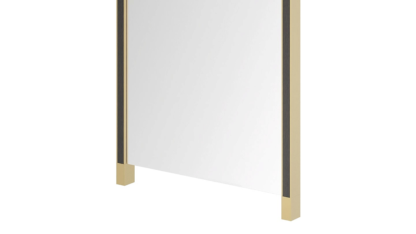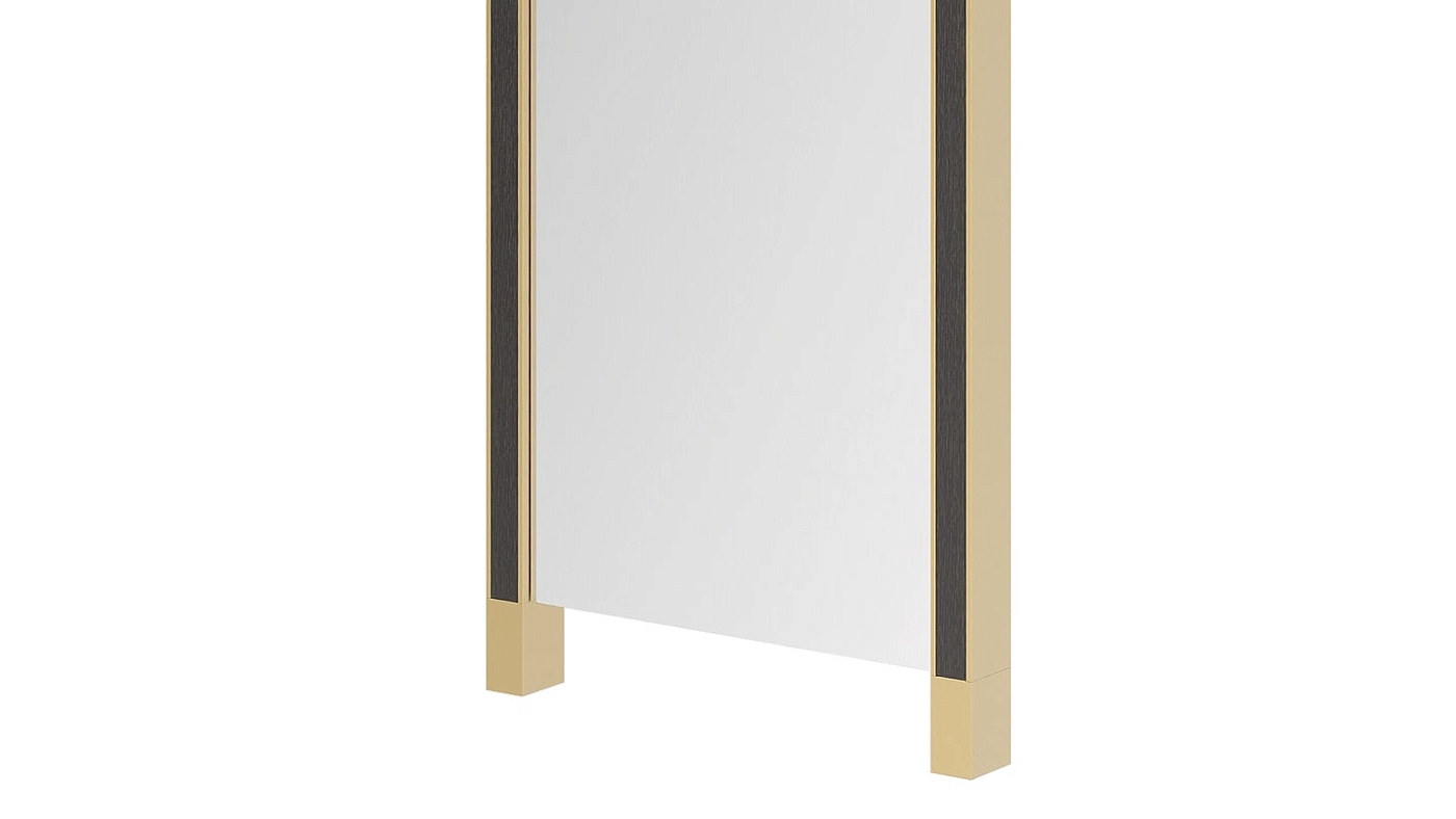 Зеркало GALWAY II привлекает внимание своей угловатой формой. Акценты из матовой латуни украшены вставками из деревянного шпона для выделяющейся отделки.