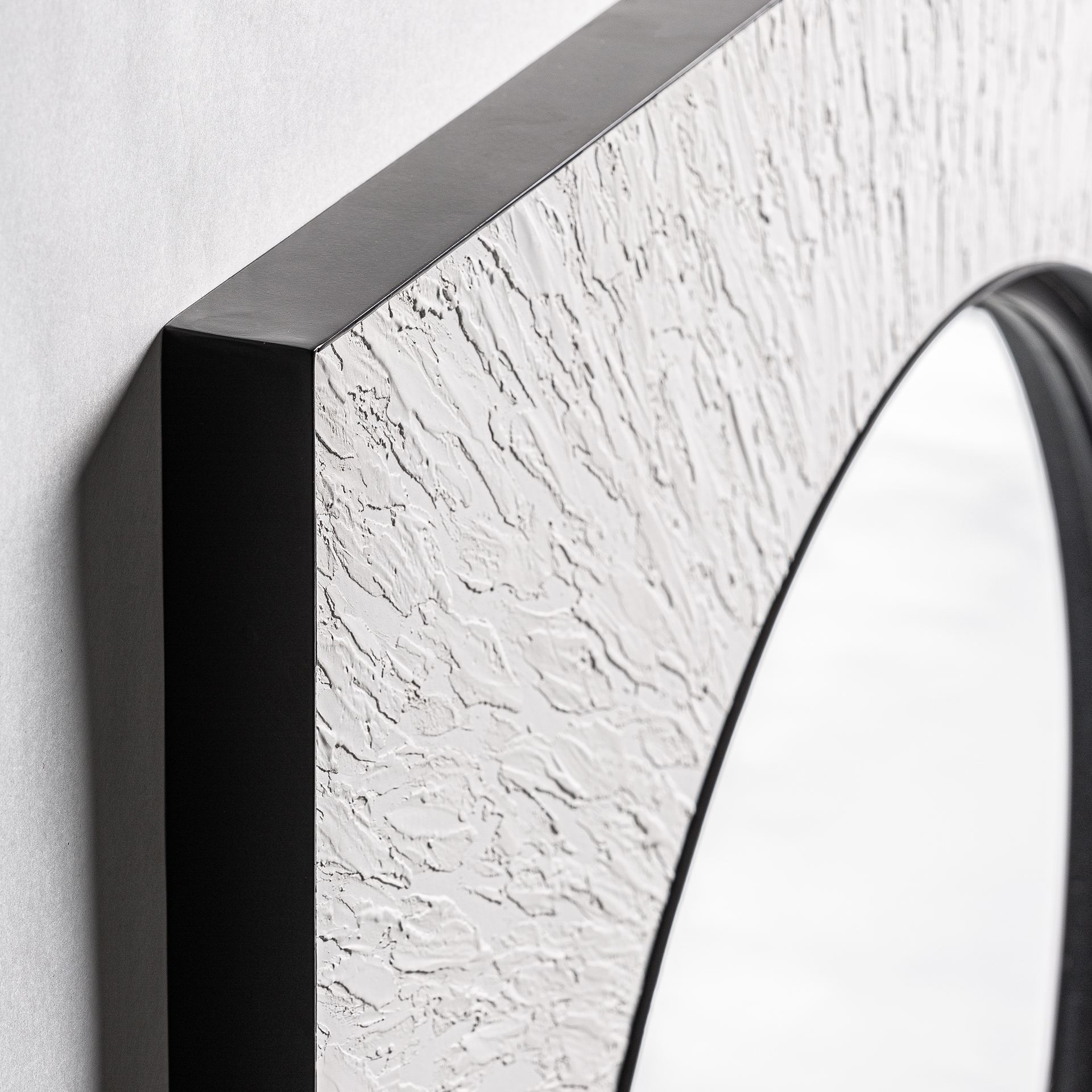 Зеркало, стиль ар-деко. Изготовлен из древесины ДМ, необработанного белого цвета, в сочетании с железом, черного и зеркального цветов.