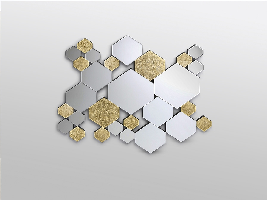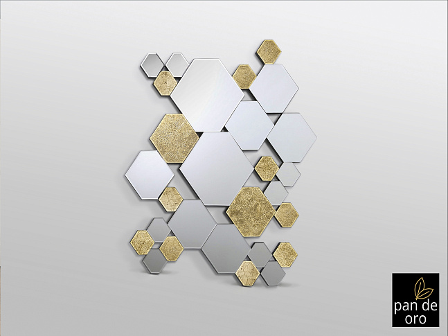 Зеркало образовано шестиугольниками лун и кристаллов с дном из ЗОЛОТОЙ ПАНЕЛИ, скошенное. Задняя часть из лакированного МДФ черного цвета. Готовы повесить в горизонтальном или вертикальном положении.