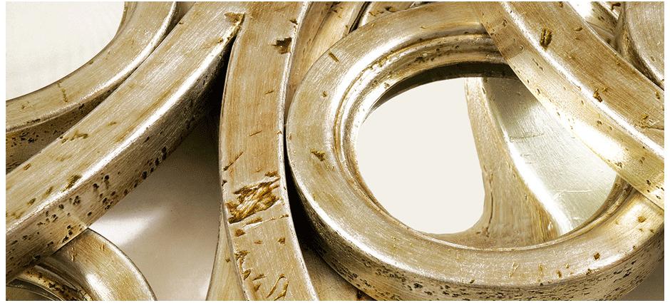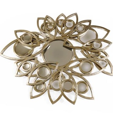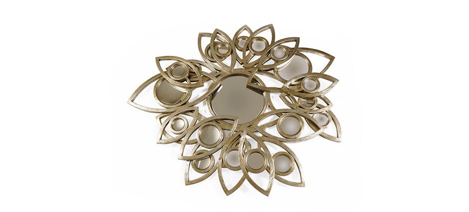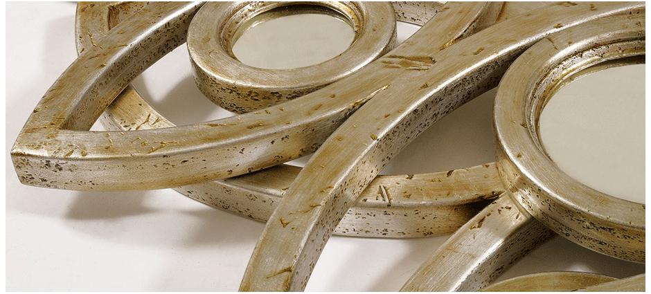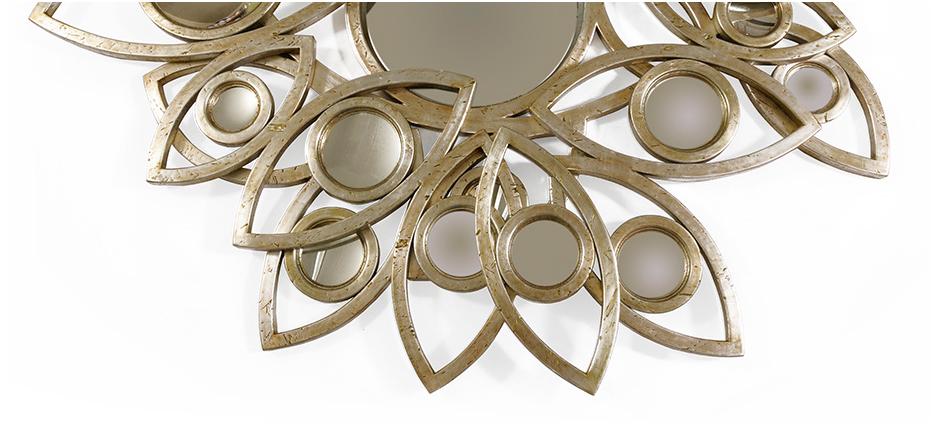 Оригинальная рама, вырезанная вручную из массива дерева, обрамляет собой центральное выпуклое зеркало. Вокруг него расположено еще 20 вогнутых зеркал меньшего радиуса. Вместе с центральным зеркалом они создают уникальную композицию, которая станет блистательным украшением интерьера любого дома. Деревянная рама зеркала покрыта листами серебра и глянцевым лаком. Для прочности каркас усилен металлическими элементами.