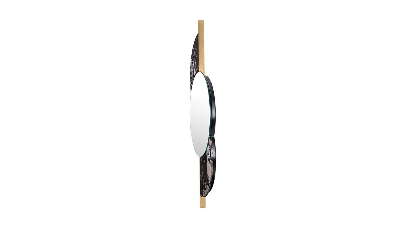 Изысканный цвет ORAN придает зеркалам, висящим на стенах, геометрическую выразительность. Являясь таким же произведением искусства, как и действующее зеркало, дизайн помещает кусок стекла без рамы поверх двух полукругов из глянцевого камня.