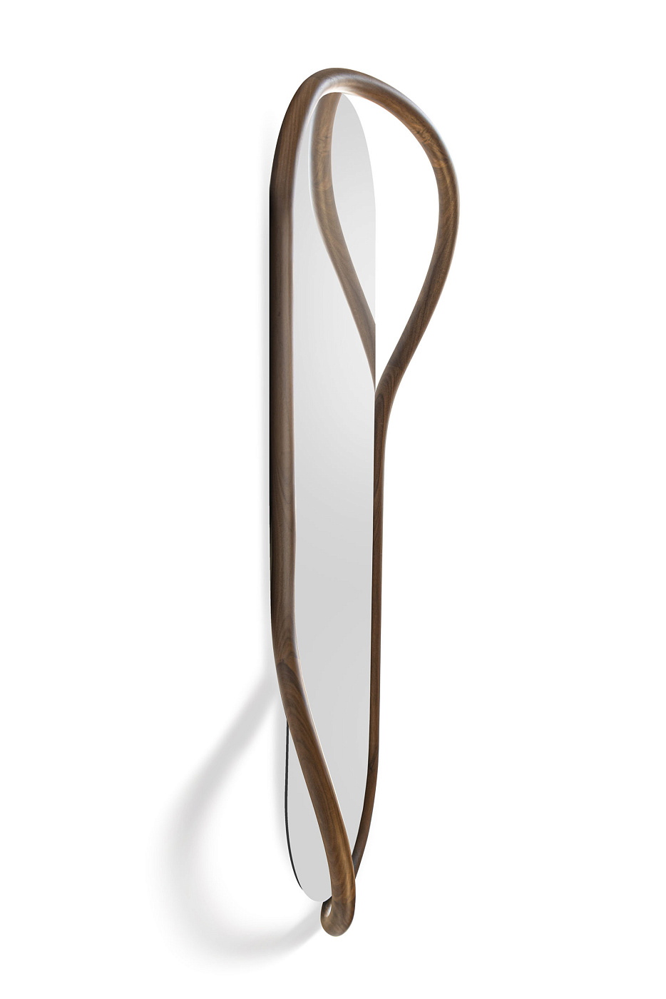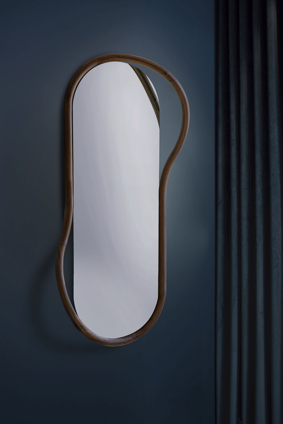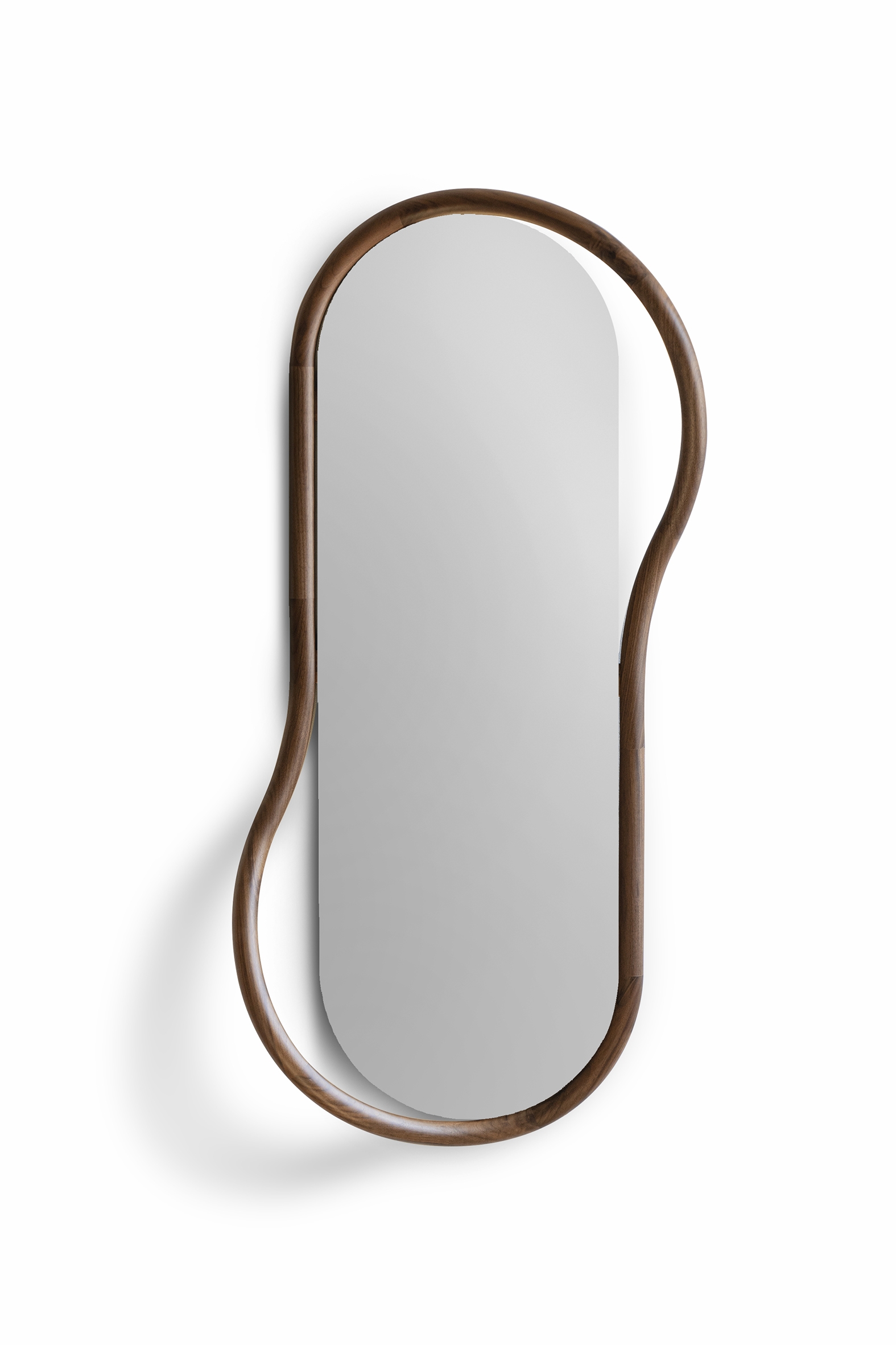 Оригинальное зеркало с изогнутой рамой из натурального орехового дерева, обрамляющее зеркало, создавая объем, напоминающий природу.