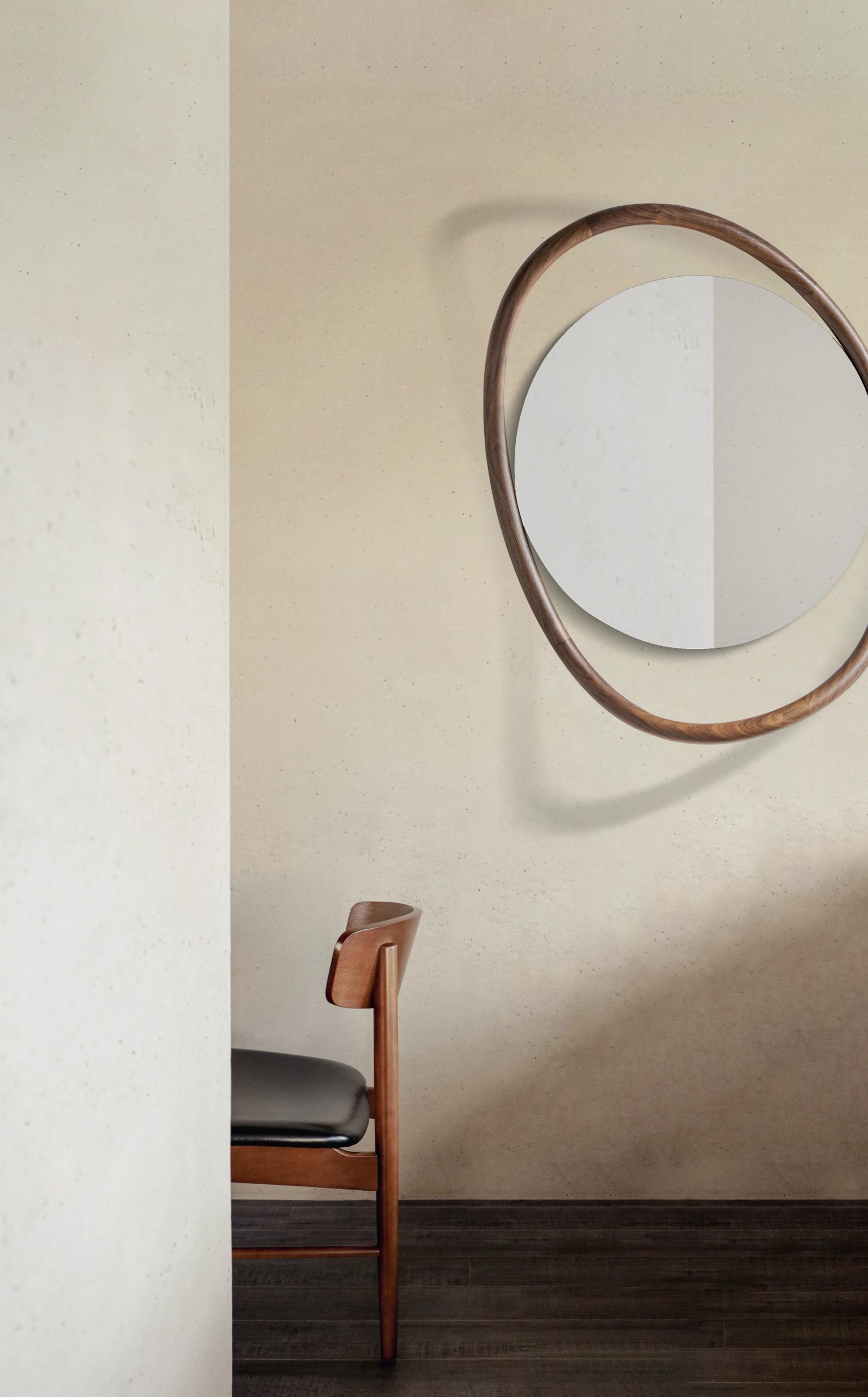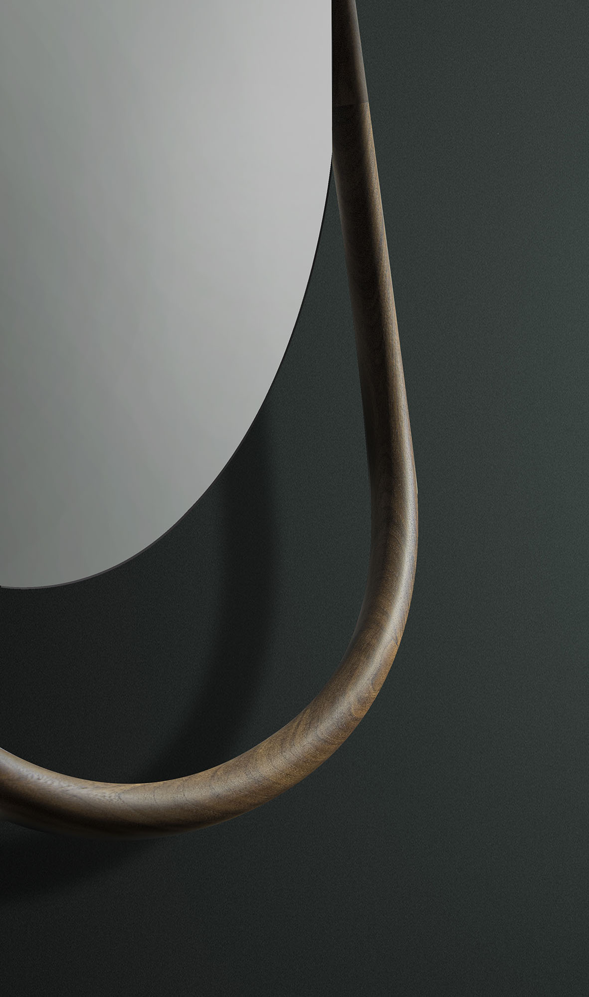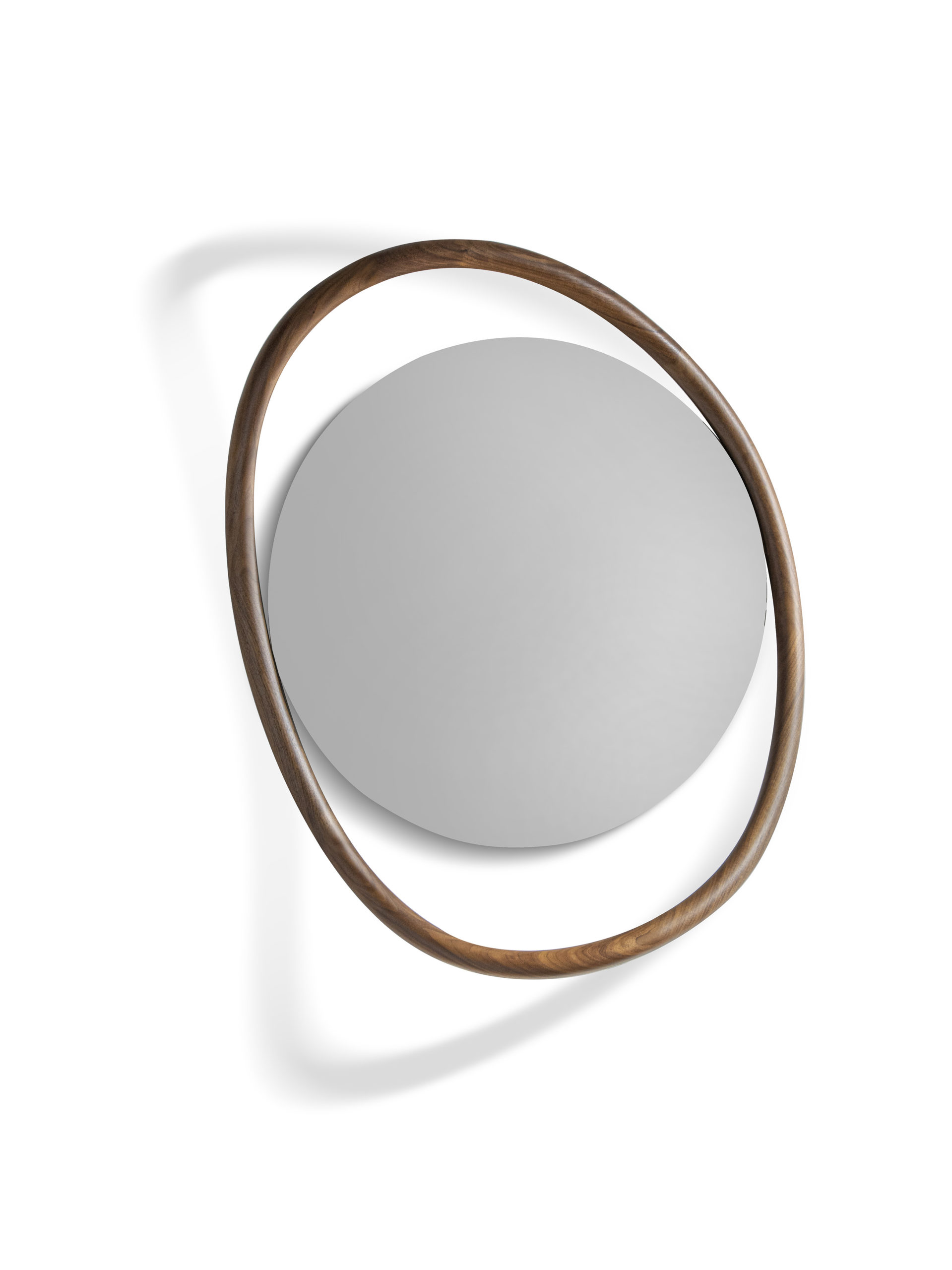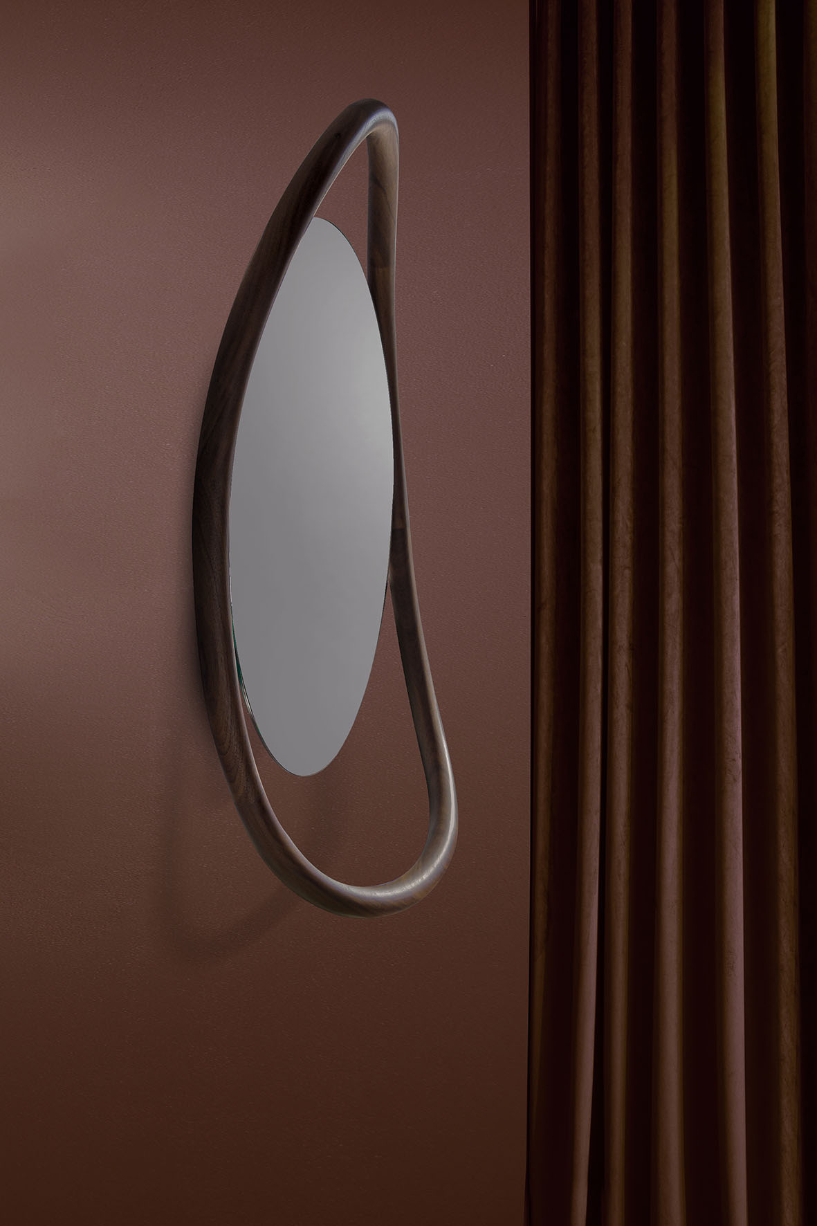 Оригинальное зеркало с изогнутой рамой из натурального дерева грецкого ореха, обрамляющее зеркало, создавая объем, напоминающий природу.