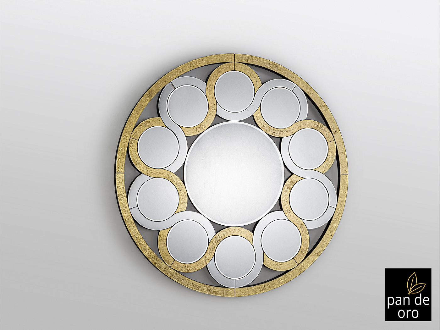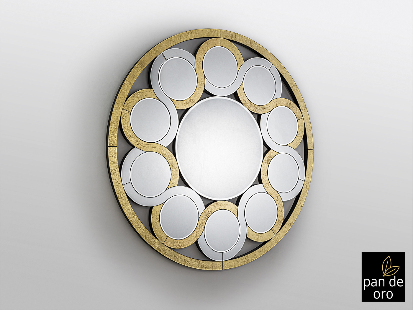 Зеркало со скошенным центральным окном. Цепочка из скошенных лун и кристаллов с обрамление в GOLDEN PAN. Задняя часть из лакированного МДФ черного цвета.